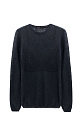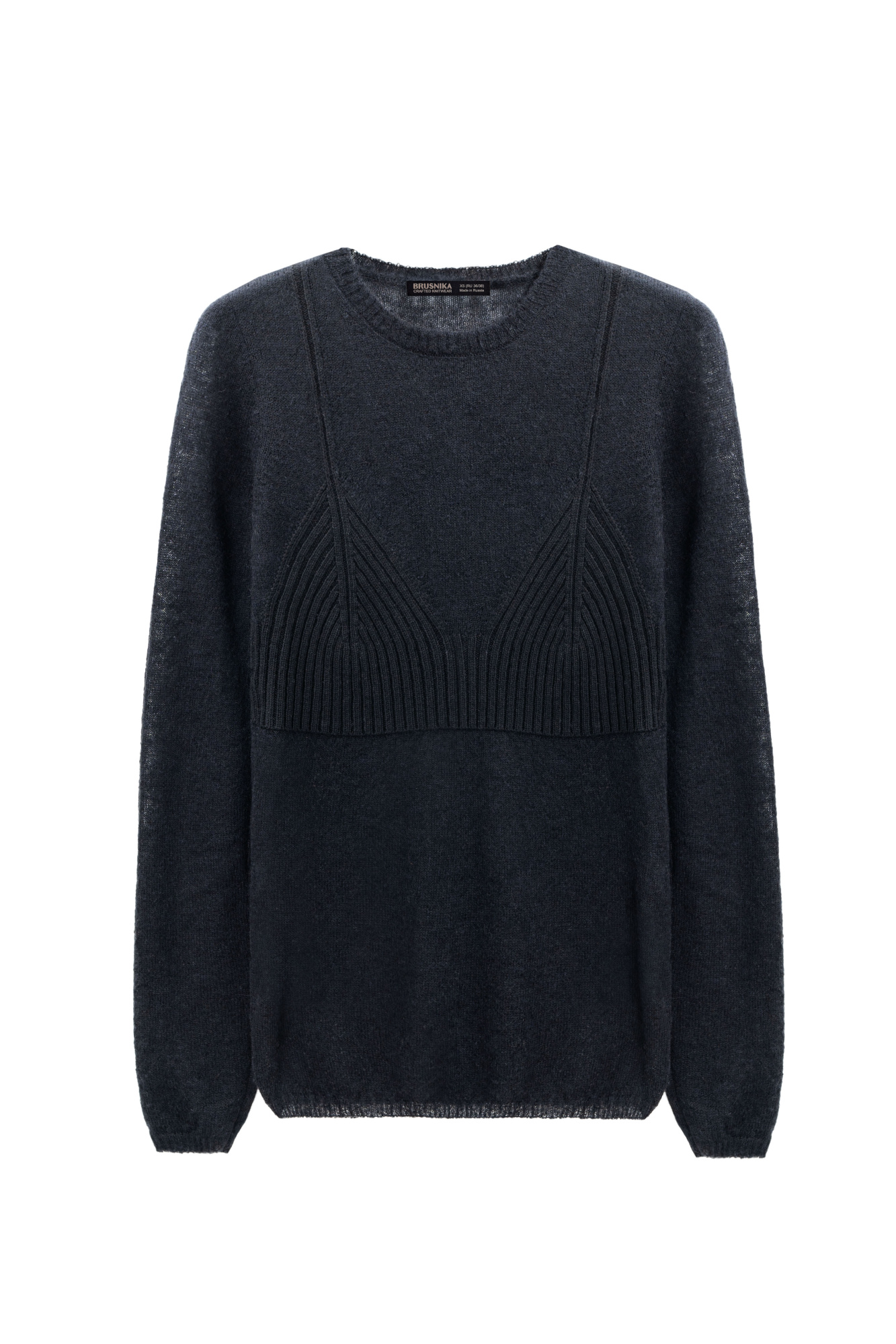 A straight-cut knit sweater with a round neckline and long sleeves. A decorative ribbed panel, mimicking the shape of a bustier, is located at the chest level. The sweater’s knit is uniform, with a slight fluffiness, characteristic of merino wool. The edges of the garment are ribbed