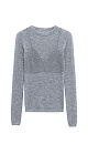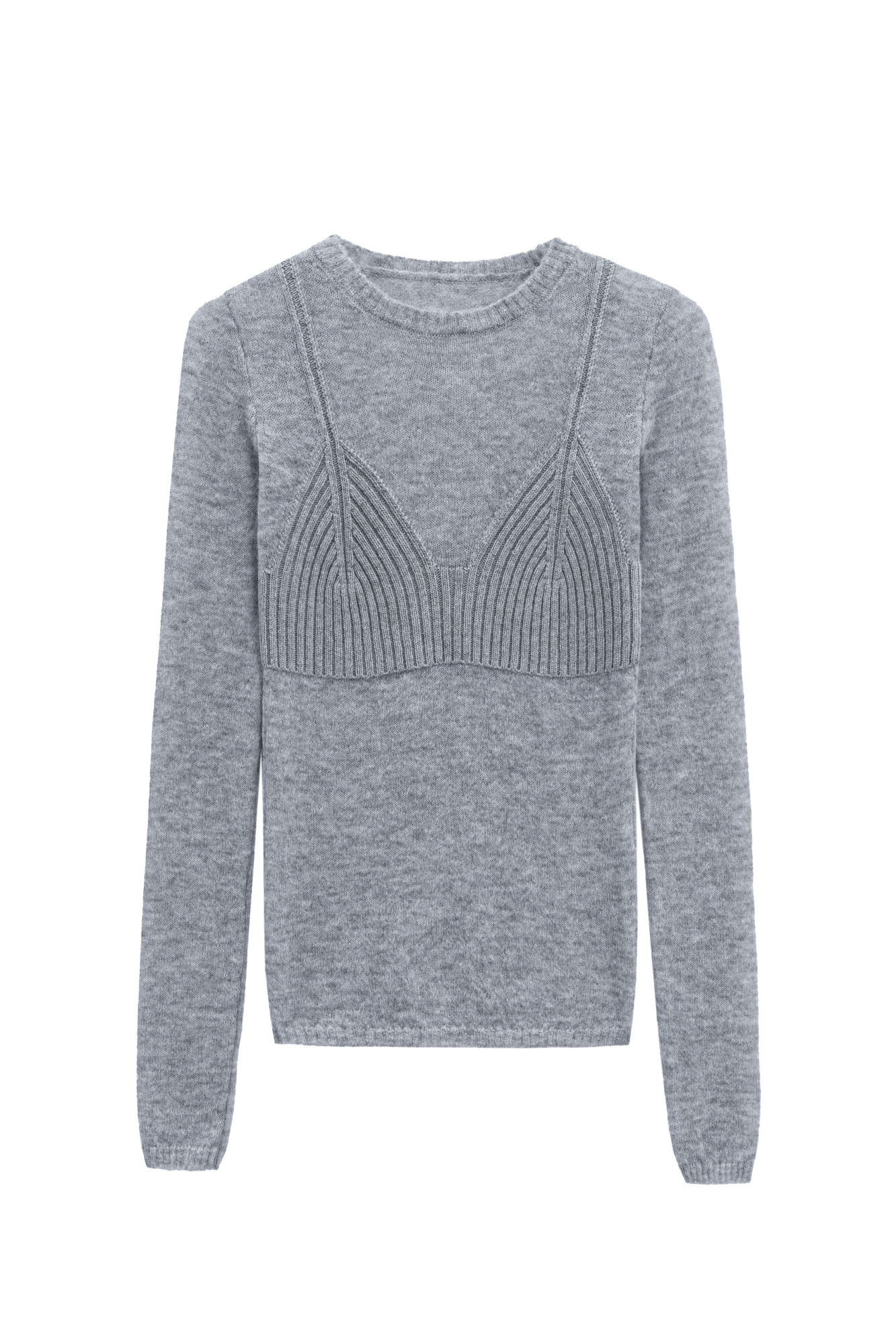 A straight-cut knit sweater with a round neckline and long sleeves. A decorative ribbed panel, mimicking the shape of a bustier, is located at the chest level. The sweater’s knit is uniform, with a slight fluffiness, characteristic of merino wool. The edges of the garment are ribbed