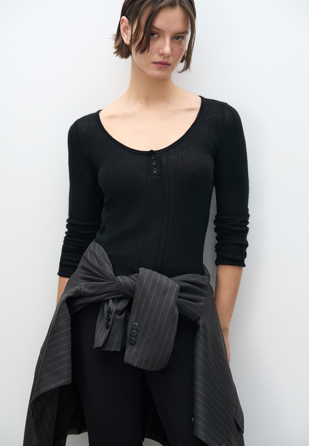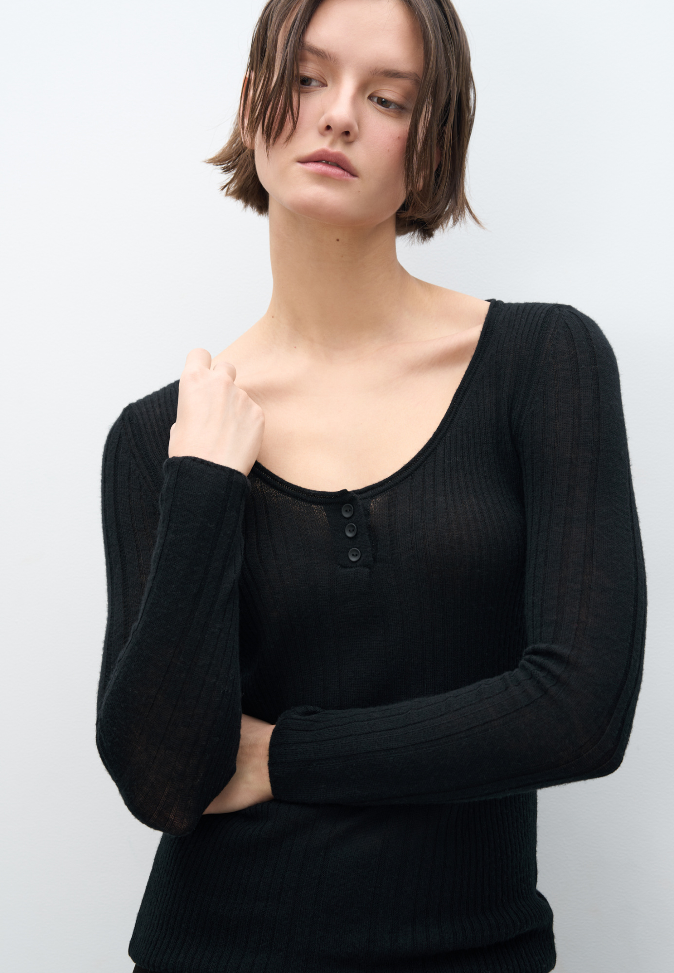 Knitted long sleeve extrafine merino wool. Model with a deep neckline with buttons.