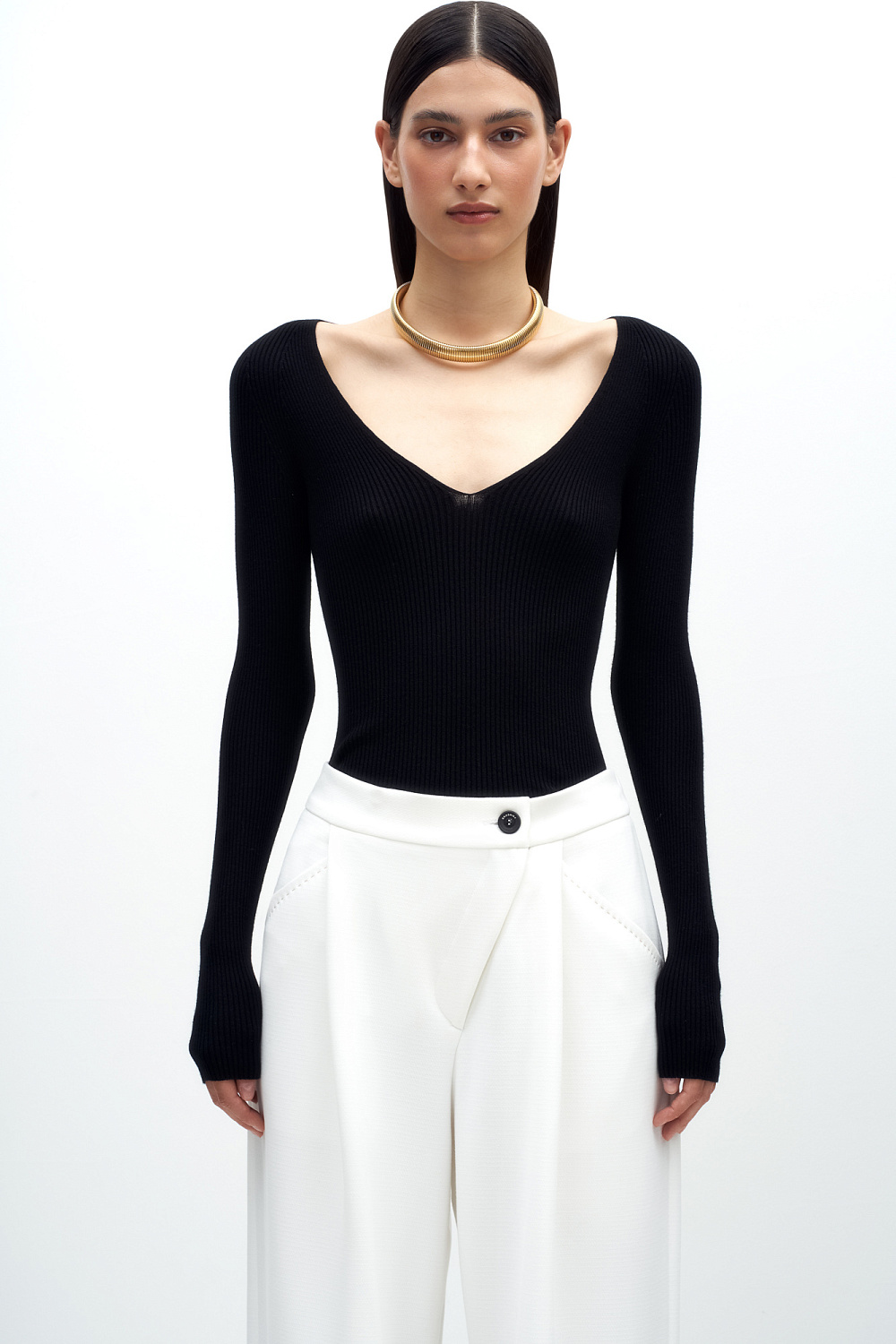 Ribbed viscose jumper with long sleeves and V-neck.
