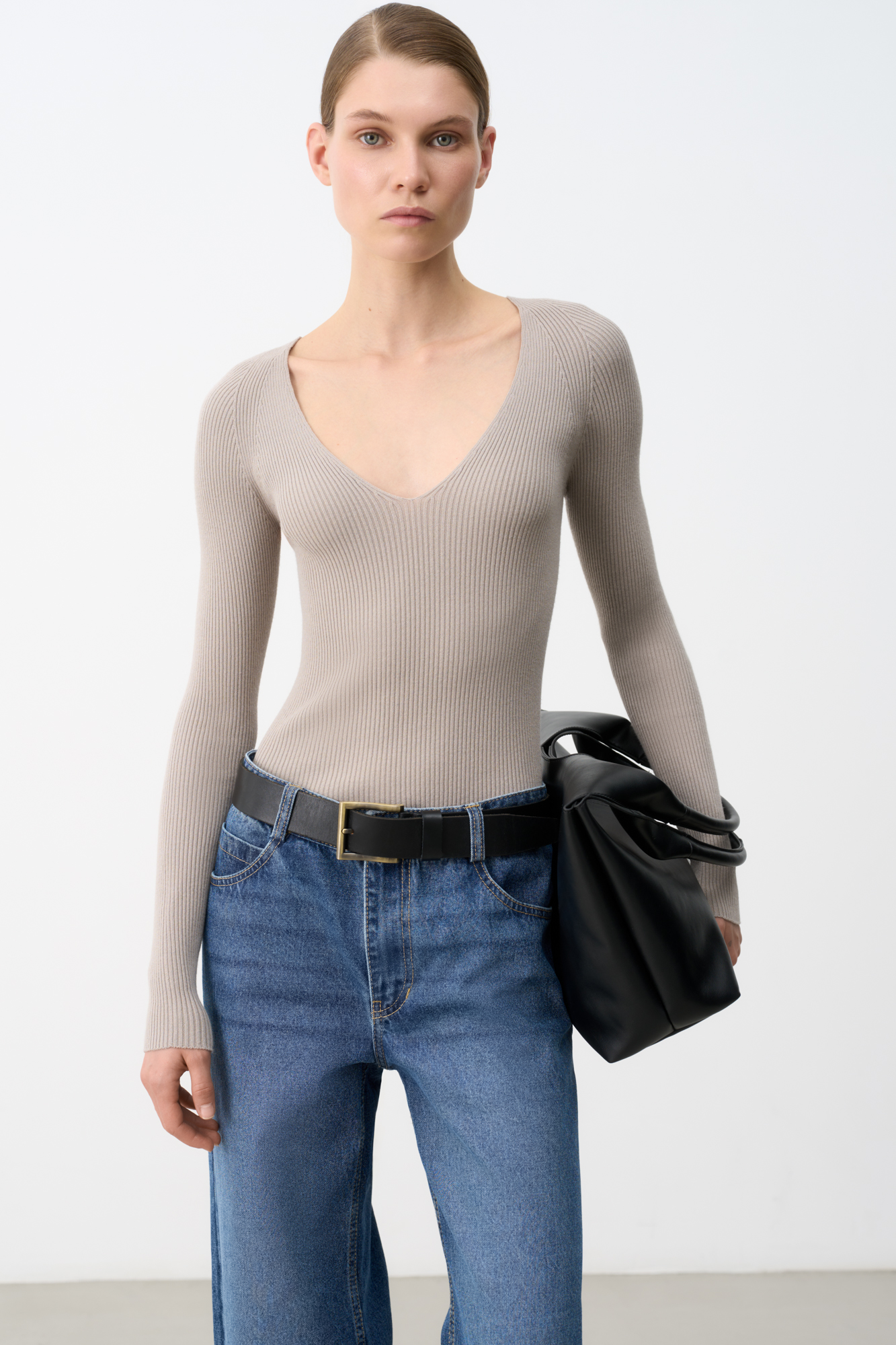 Ribbed viscose jumper with long sleeves and V-neck.