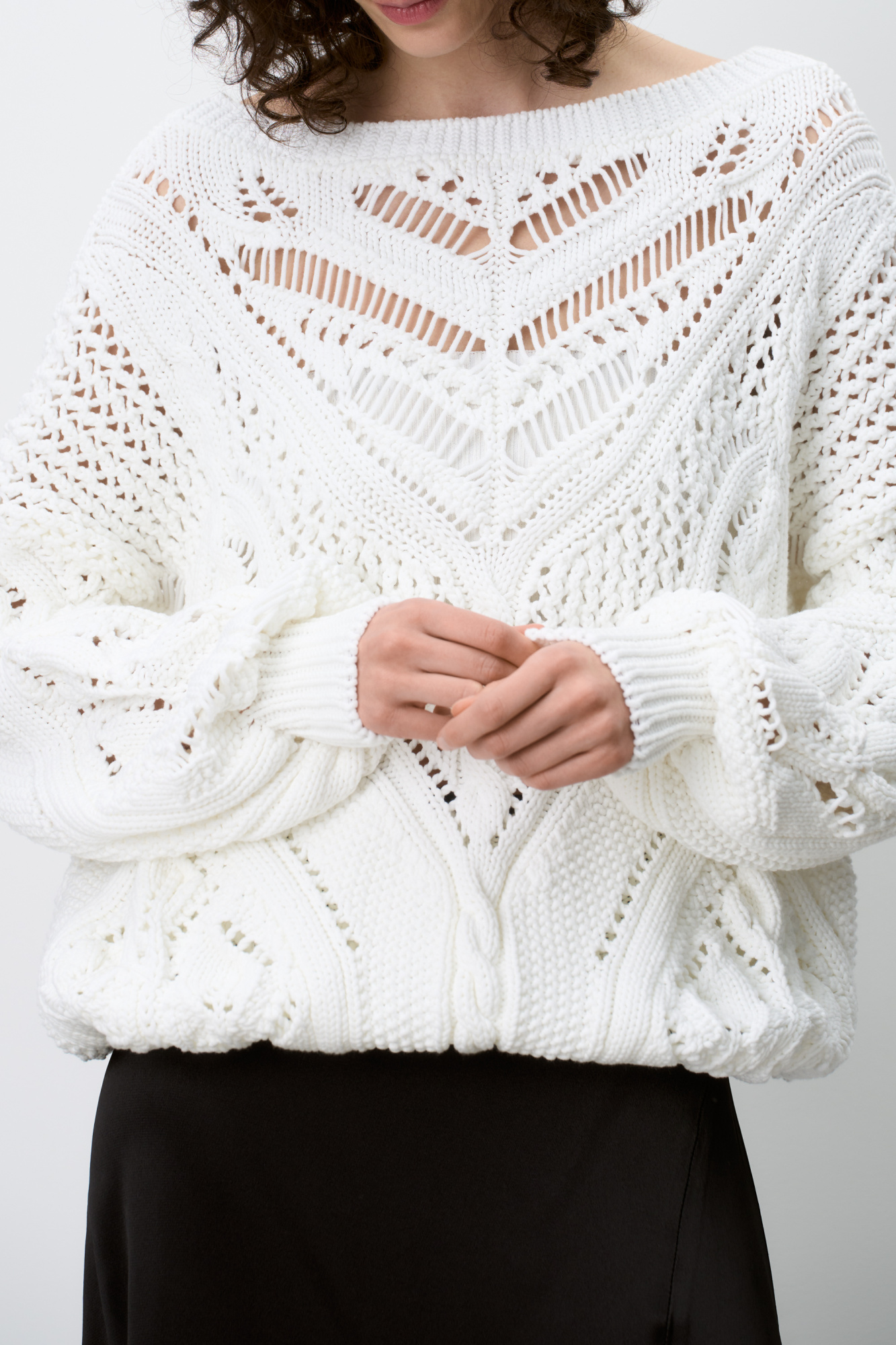Openwork cotton jumper with V-neck. Loose fit, long sleeves with cuffs. Pairs perfectly with trousers or skirt, and the jumper can be worn either with a cutout on the chest or on the back.
