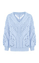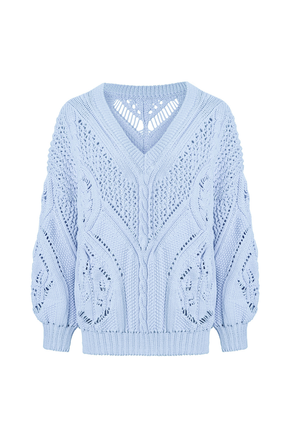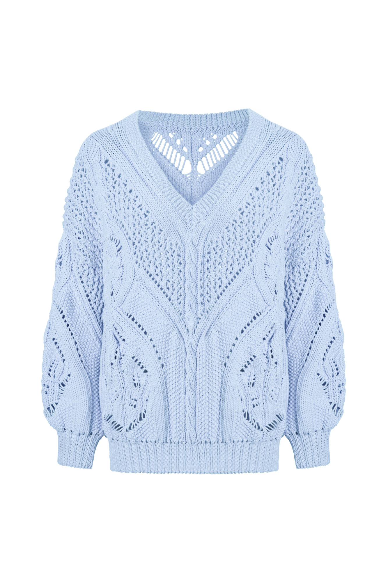 Openwork cotton jumper with V-neck. Loose fit, long sleeves with cuffs. Pairs perfectly with trousers or skirt, and the jumper can be worn either with a cutout on the chest or on the back.
