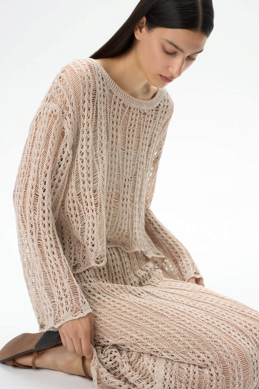 Semi-sheer openwork jumper. Features loose silhouette and dropped shoulders line. You can complement the look with a matching skirt.