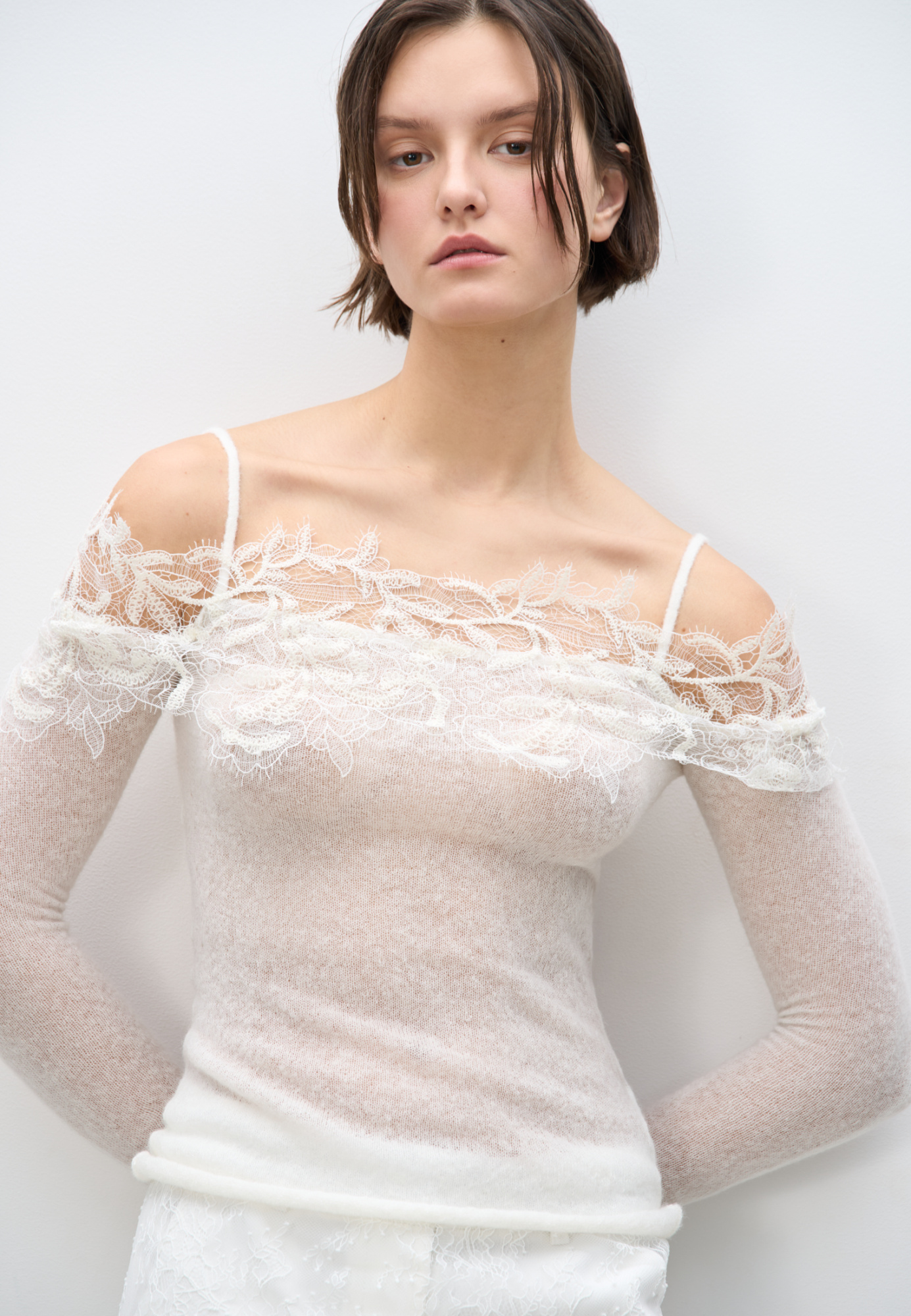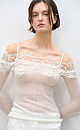 Knitted long sleeve from extrafine merino wool and superfine alpaca. Fitted with thin straps, long sleeves and open shoulders. The neckline is decorated with lace.