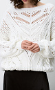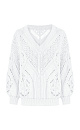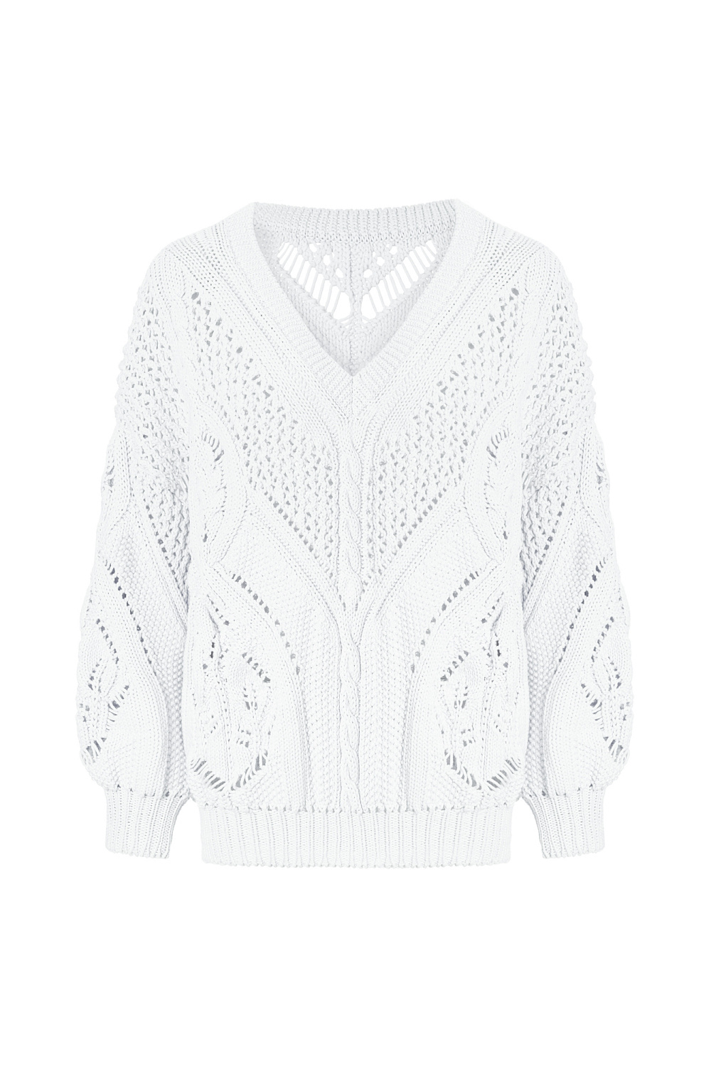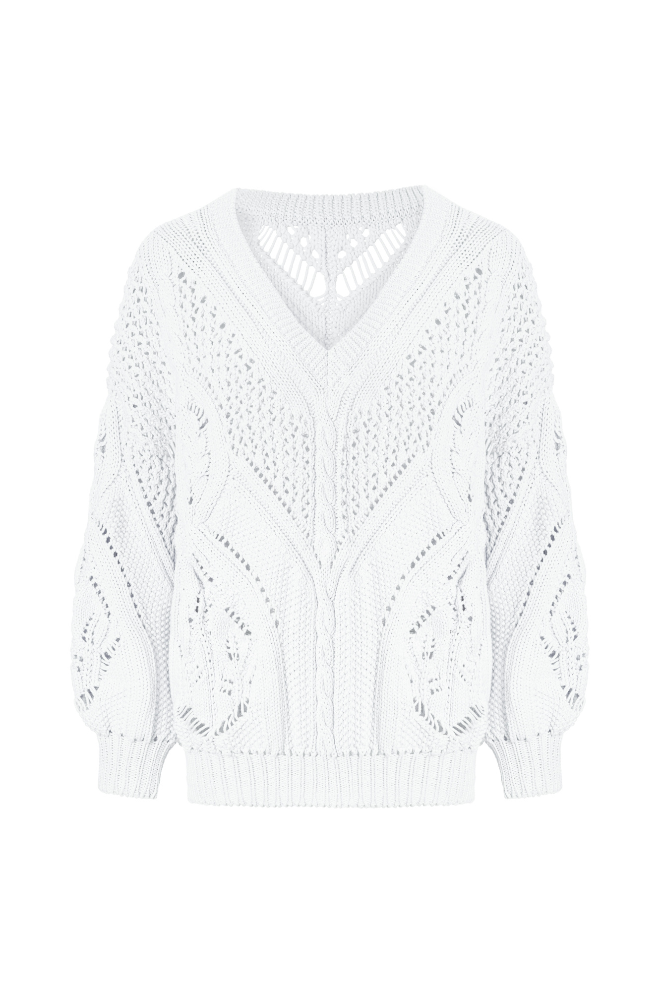 Openwork cotton jumper with V-neck. Loose fit, long sleeves with cuffs. Pairs perfectly with trousers or skirt, and the jumper can be worn either with a cutout on the chest or on the back.
