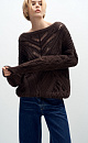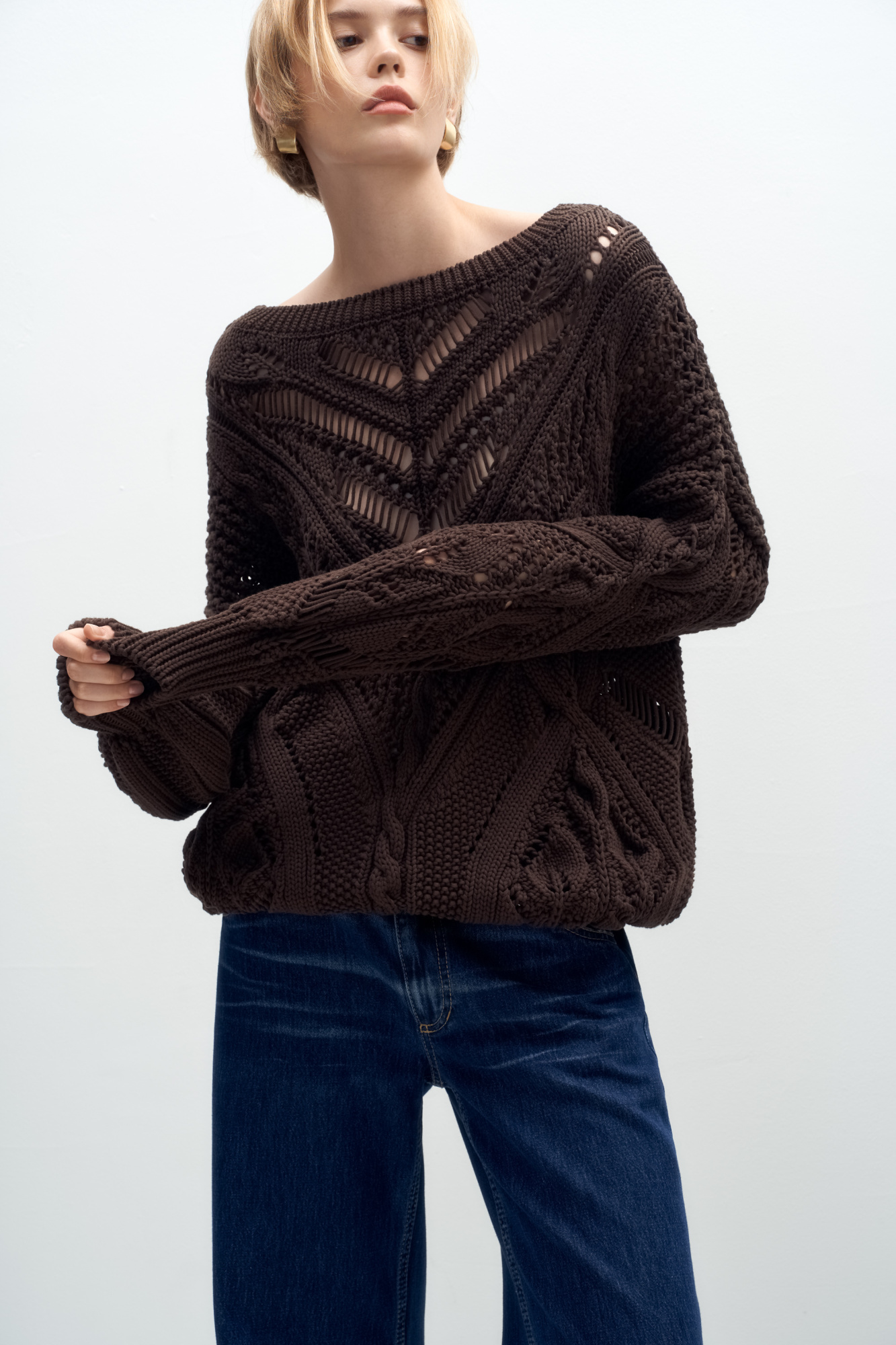 Openwork cotton jumper with V-neck. Loose fit, long sleeves with cuffs. Pairs perfectly with trousers or skirt, and the jumper can be worn either with a cutout on the chest or on the back.