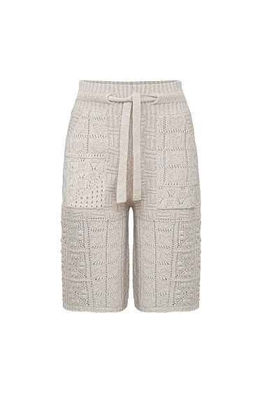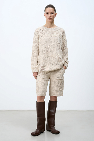 Wool blend knit jumper. Loose-fit silhouette with a dropped shoulders and an openwork weave. Pairing with a matching skirt and shorts.