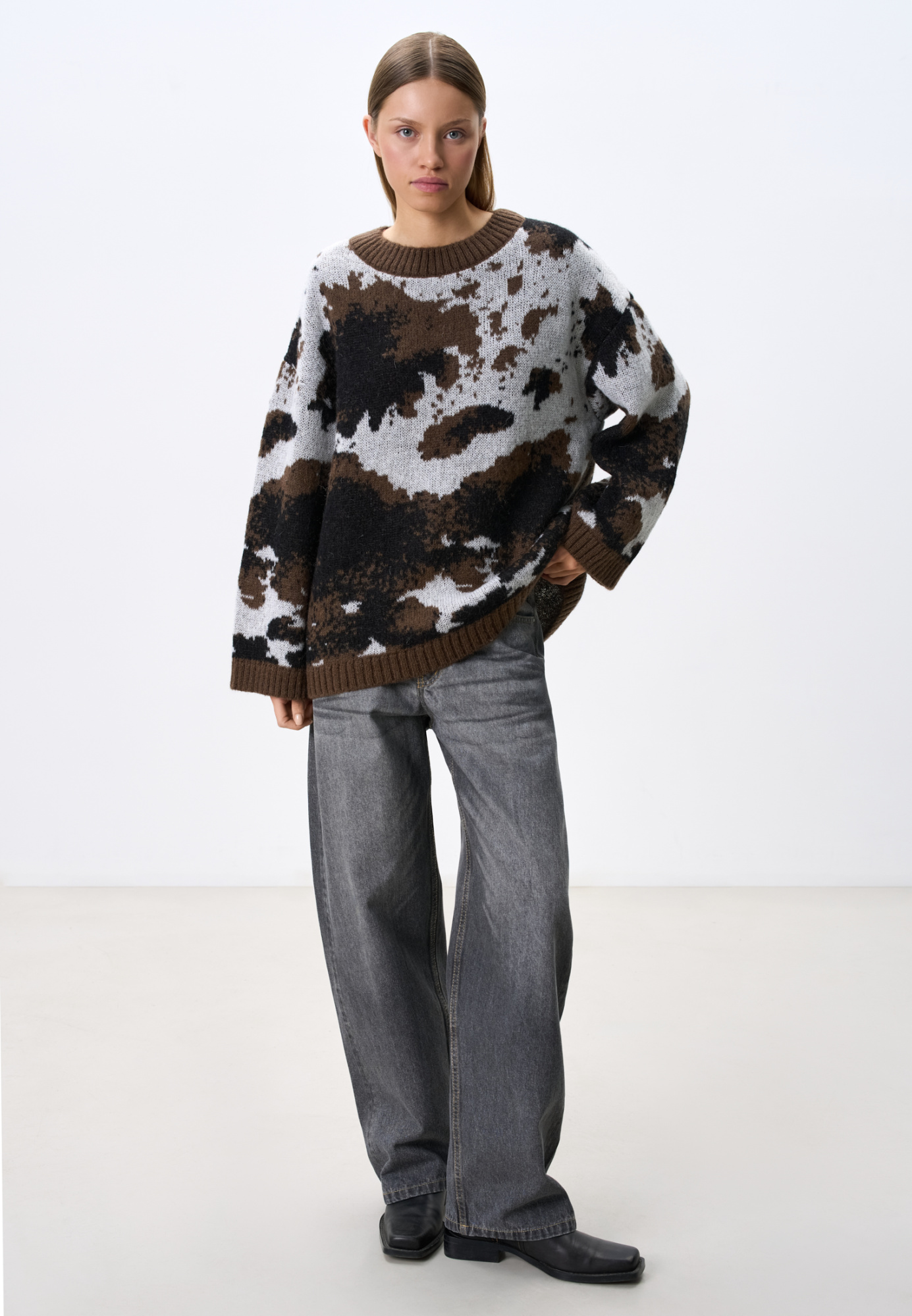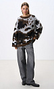 Knitted jumper with jacquard animal design in wool and mohair. Model of a loose silhouette with a dropped shoulder line, with a round neckline. The edges of the product are ribbed.