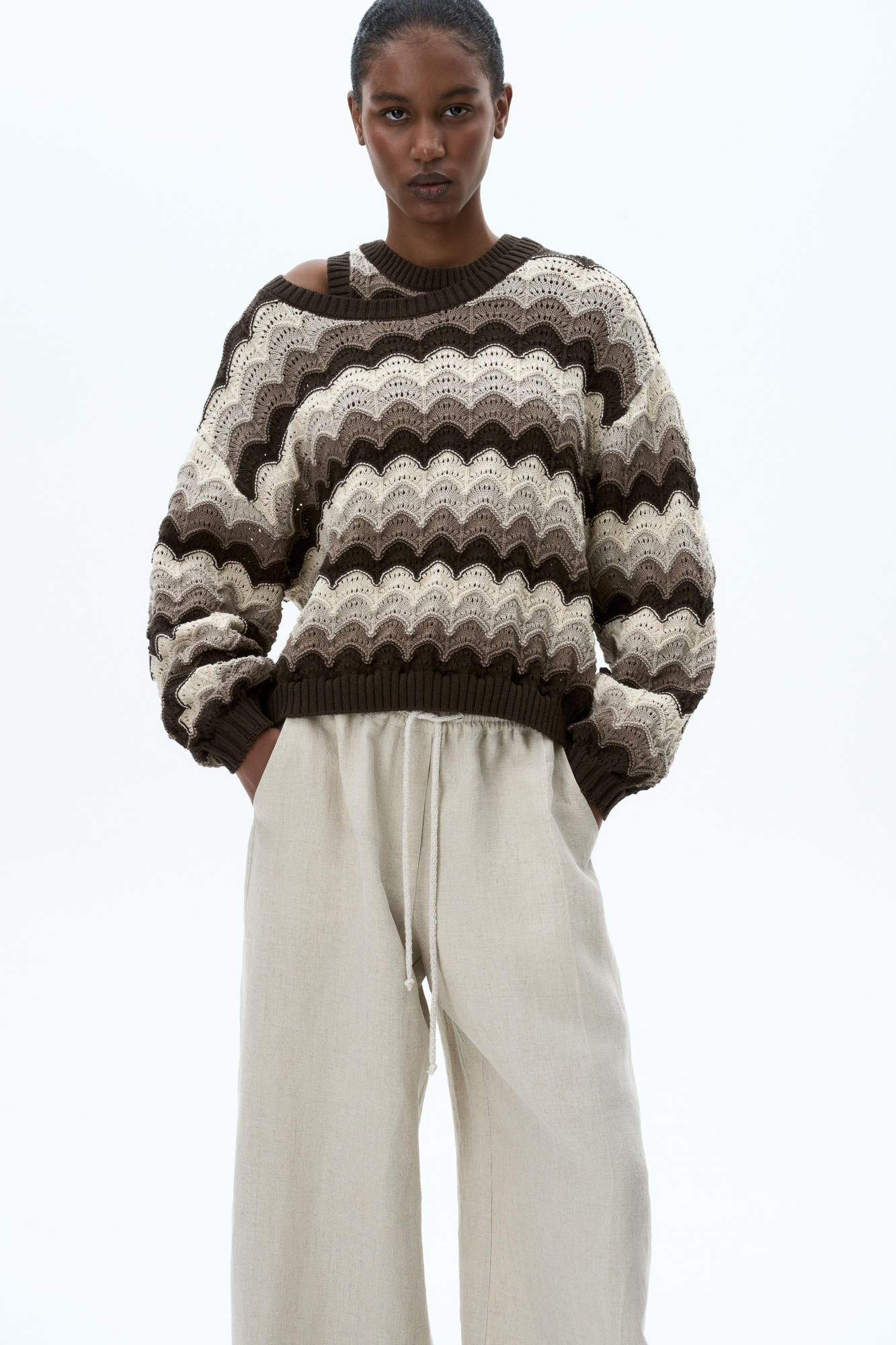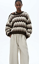 Knitted cotton jumper with a wavy pattern. Loose silhouette with dropped shoulder line. The edges of the jumper are ribbed. You can complement the look with a skirt with a similar pattern.