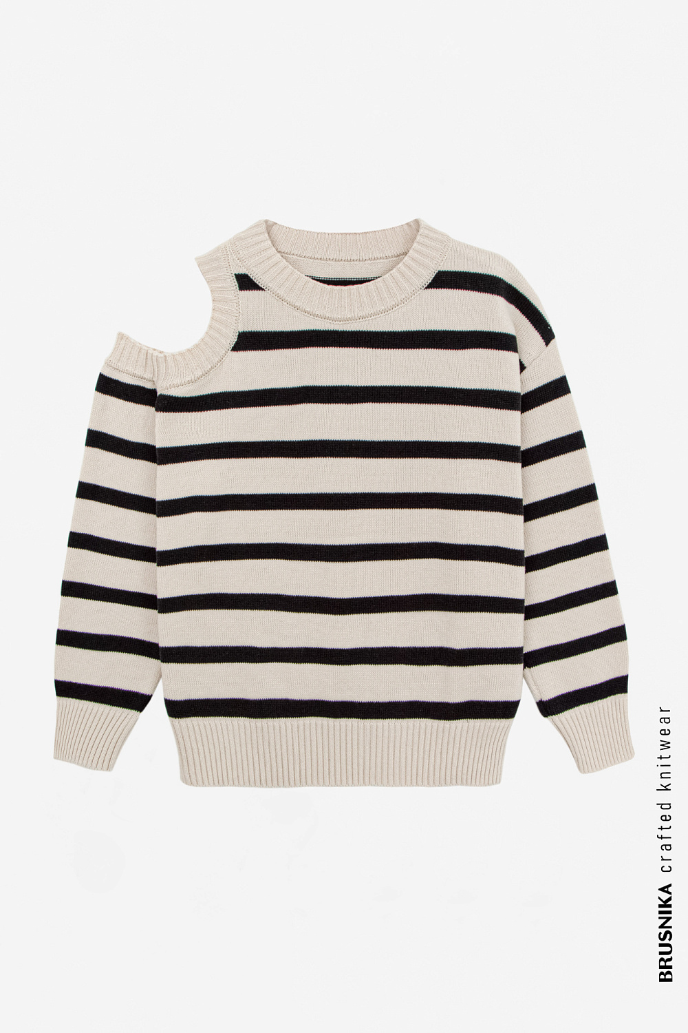 100% cotton striped knit jumper with cut-out shoulder. Ribbed cuffs and hem.
