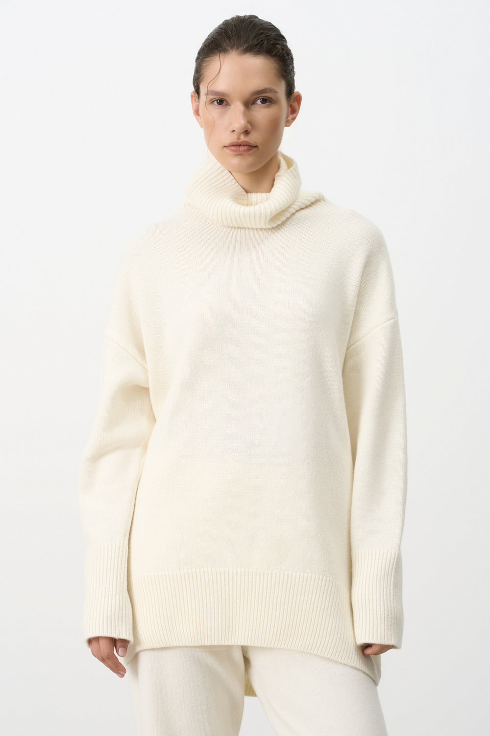Wool and cashmere blend turtleneck jumper with longline back. Pairs perfectly with matching pants.