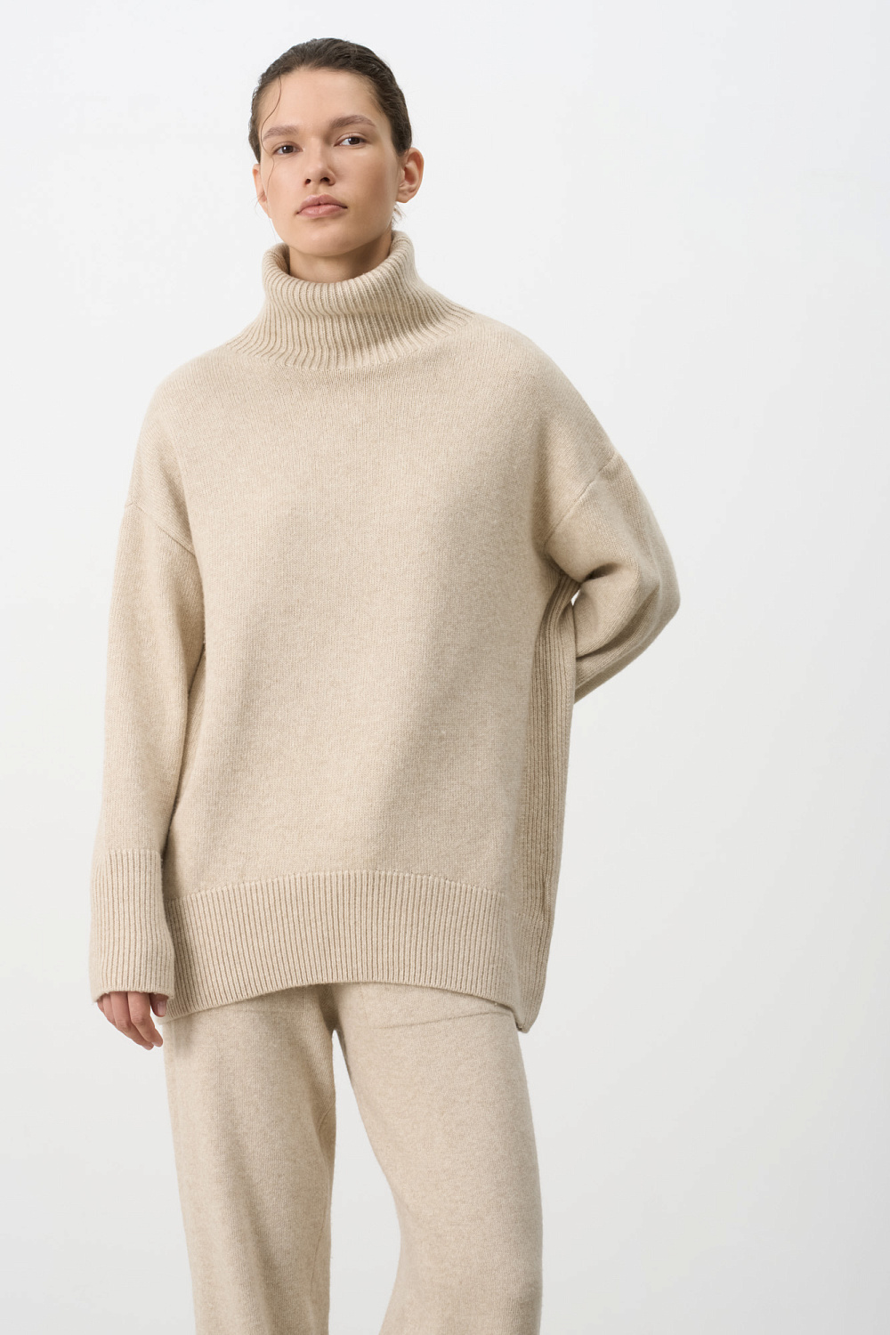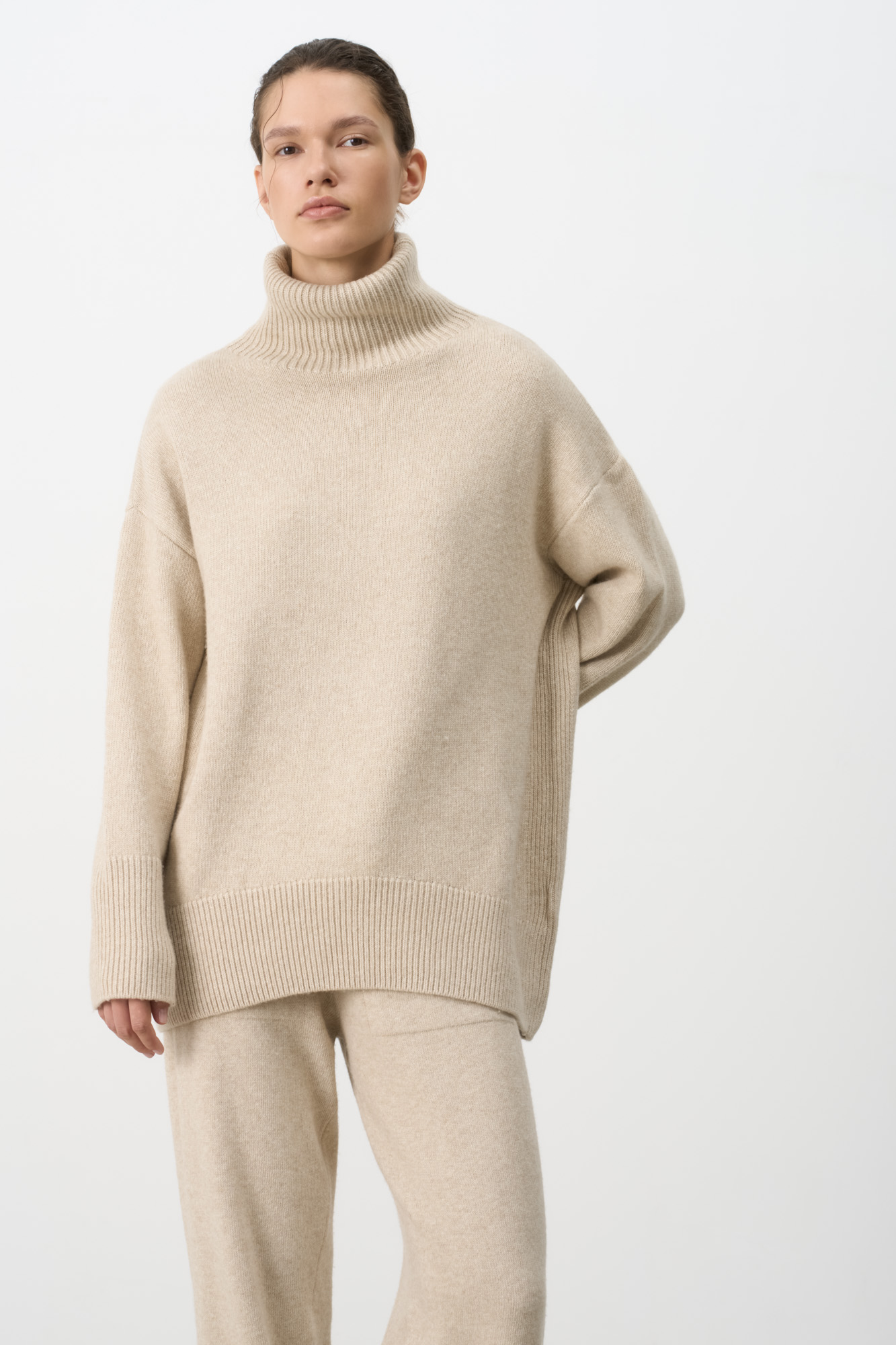 Wool and cashmere blend turtleneck jumper with longline back. Pairs perfectly with matching pants.