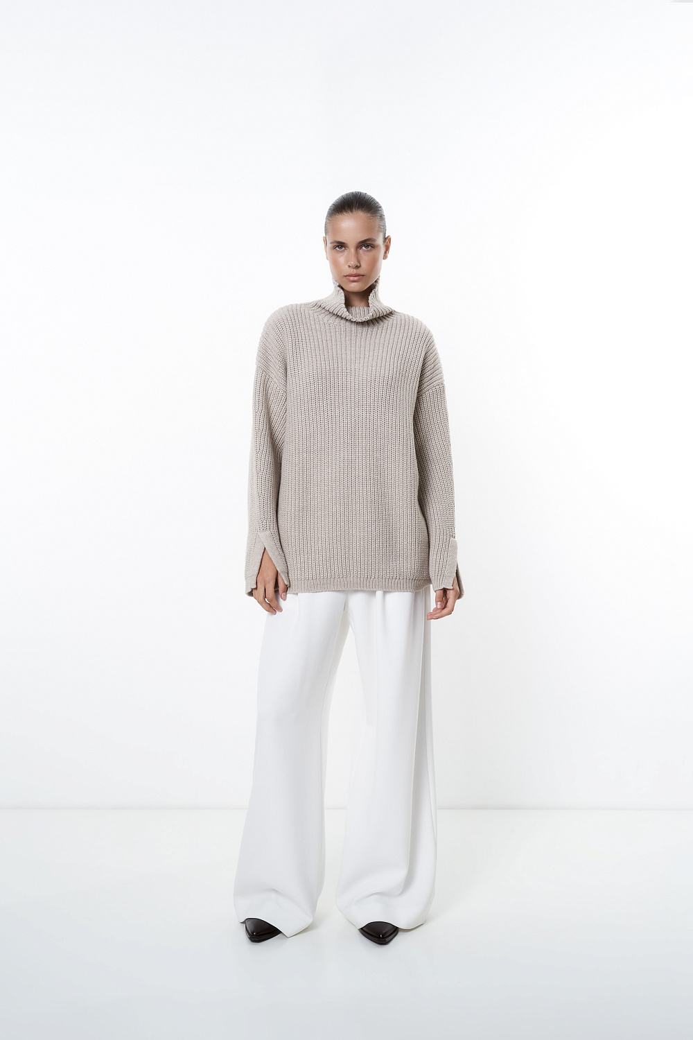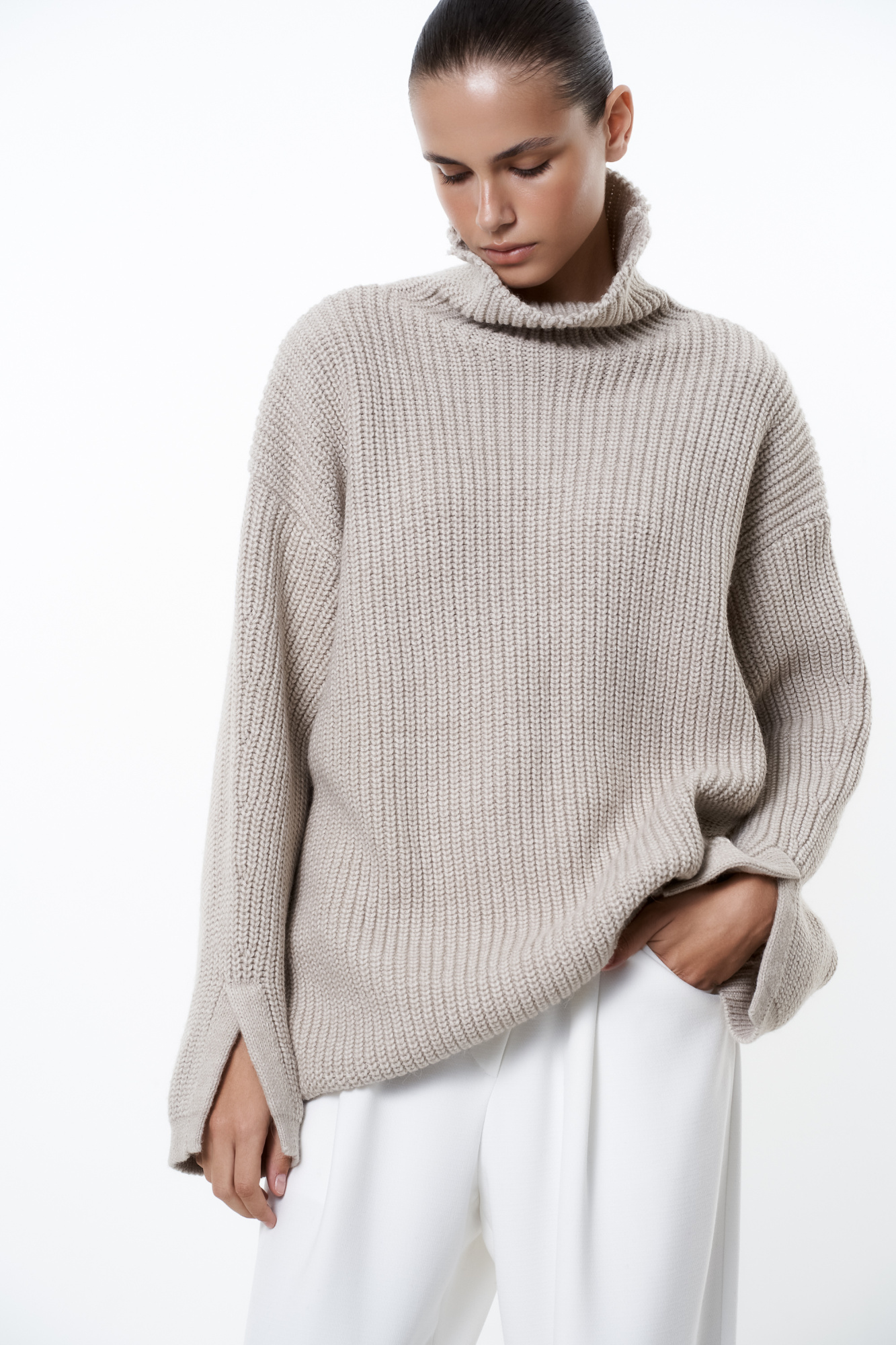 Alpaca wool knit jumper. Loose silhouette with a dropped shoulders, a high collar and slits at the cuffs.