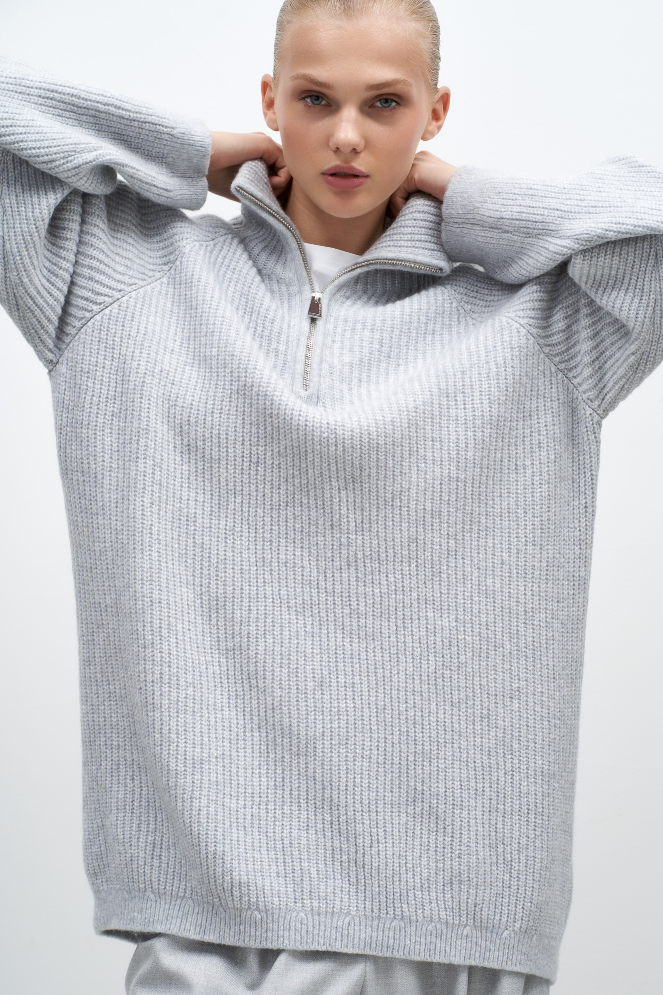 Oversized jumper made of soft extrafine merino wool. Stand-up collar with zip closure.