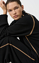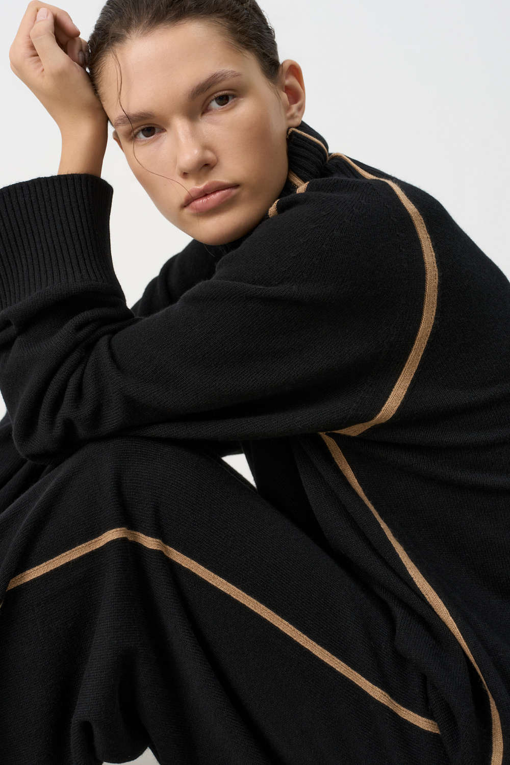 Wool blend knit jumper. Loose silhouette with stripes, a high collar and dropped shoulders. You can complete the look with matching pants.