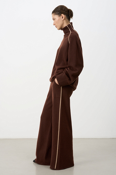 Wool blend knit jumper. Loose silhouette with stripes, a high collar and dropped shoulders. You can complete the look with matching pants.
