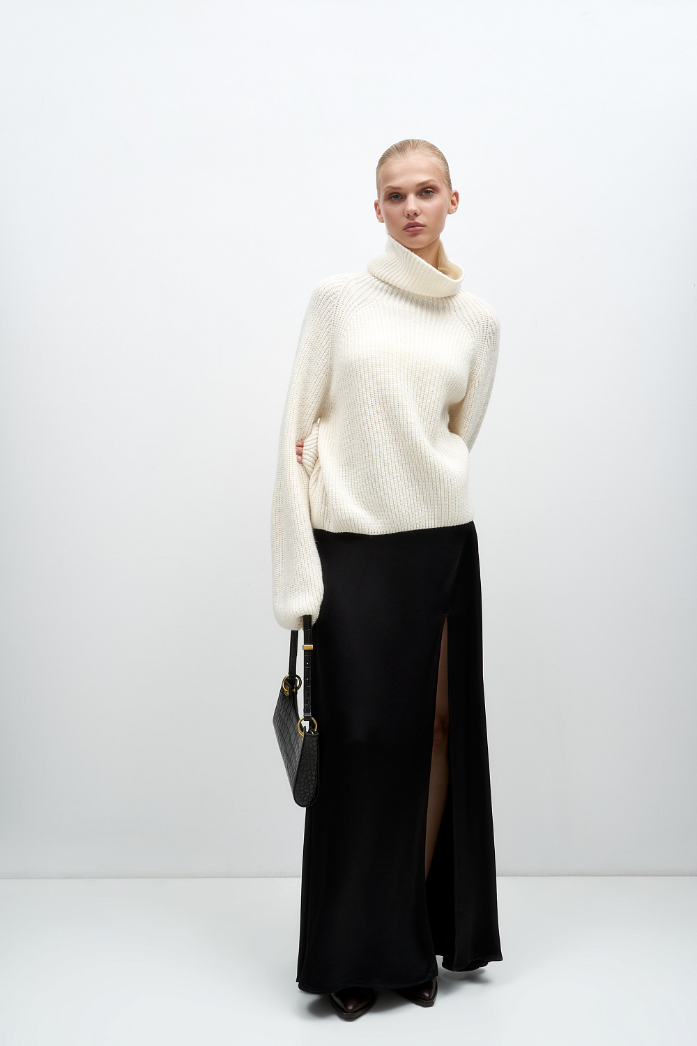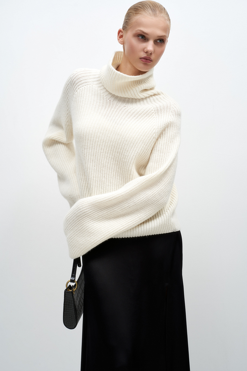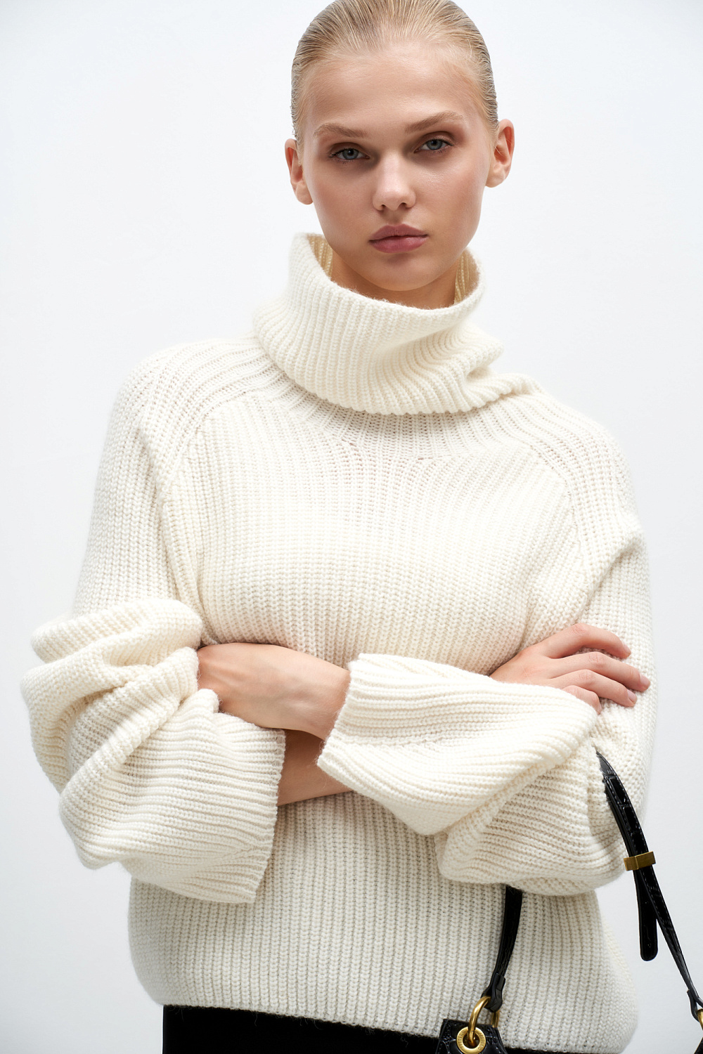Rib-knit alpaca wool cropped jumper. Loose silhouette with high collar