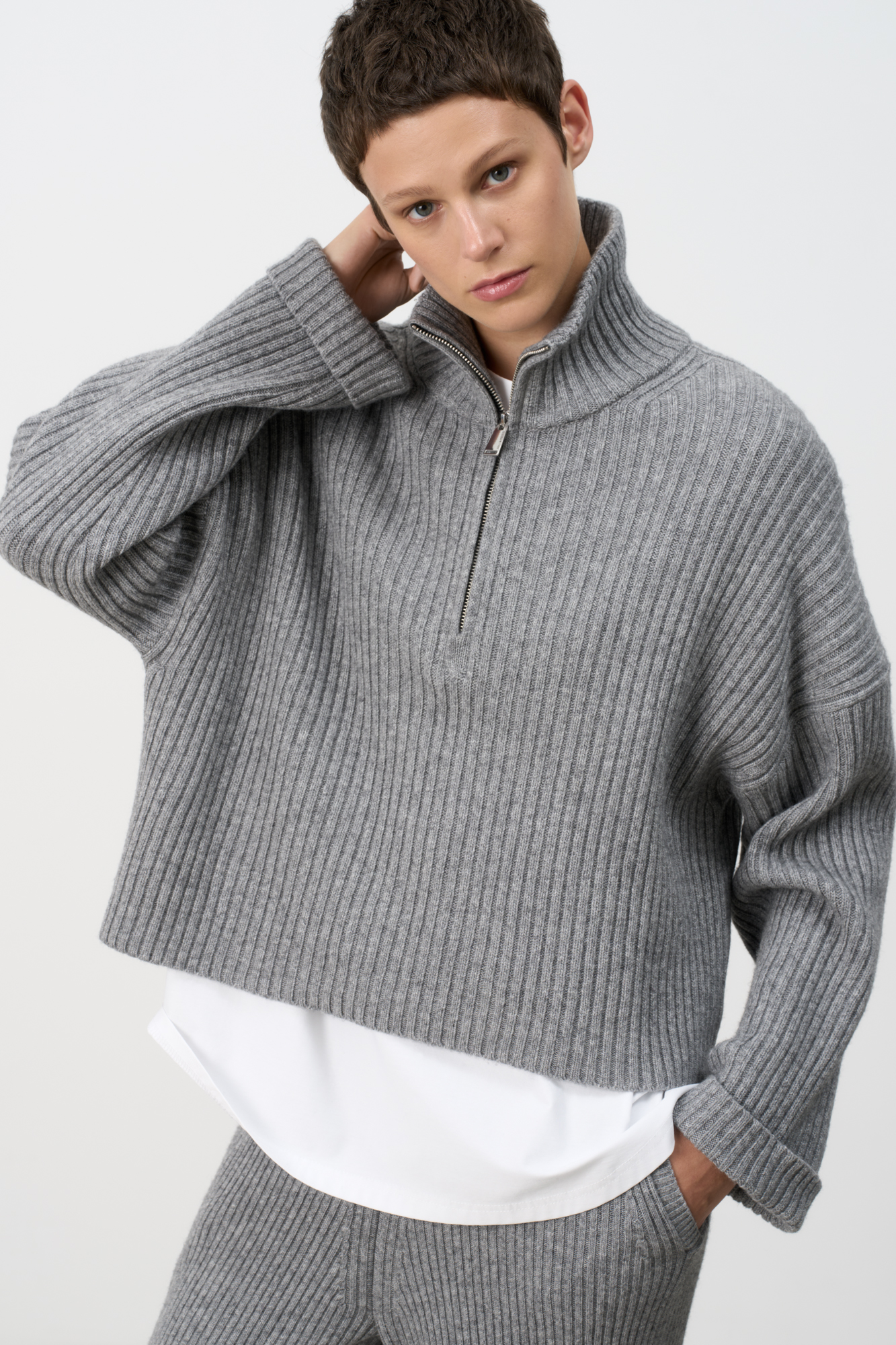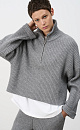 Jumper made of soft wool, loose silhouette with a high collar and zip fastening.