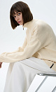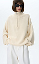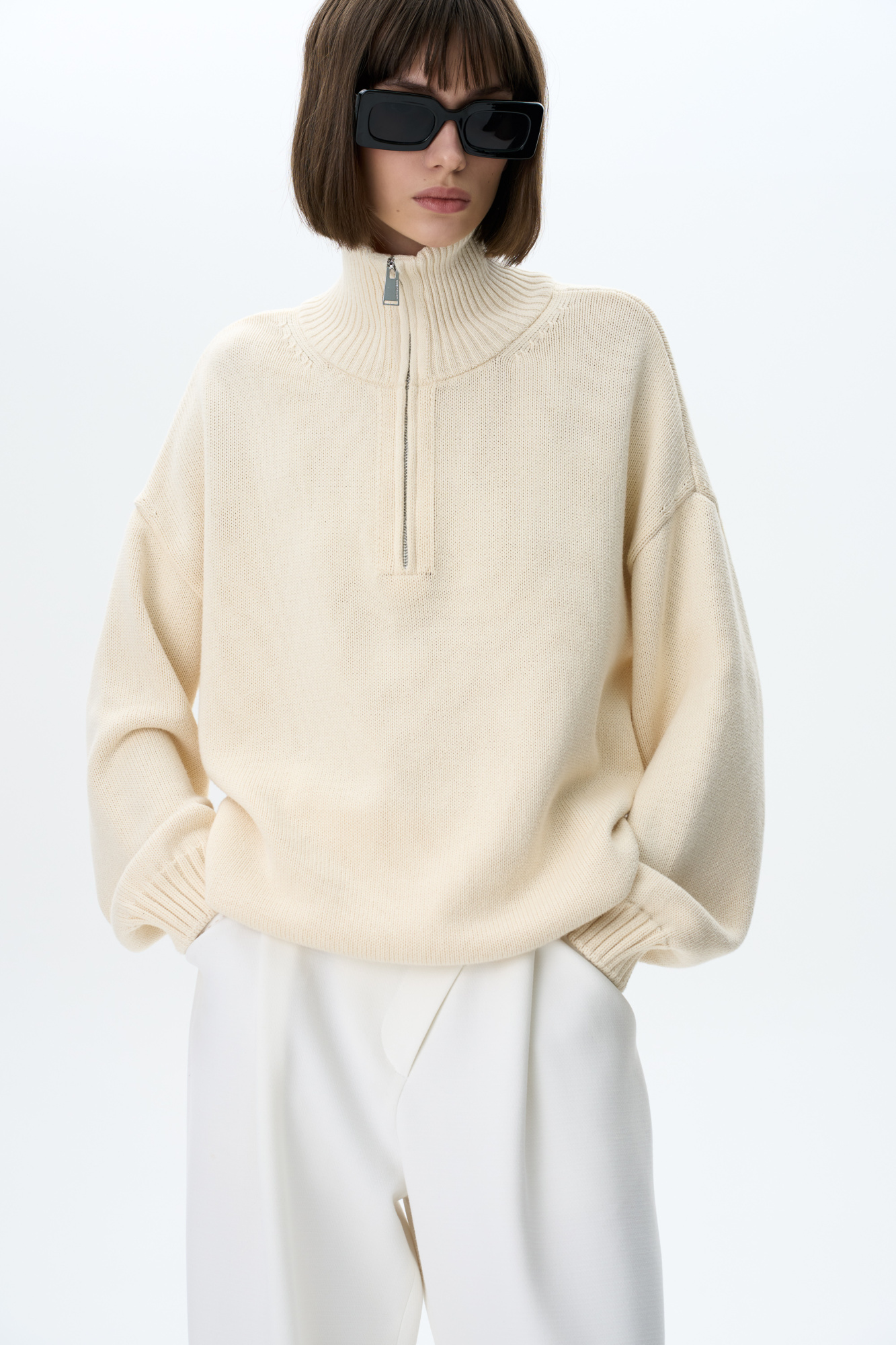 100% cotton jumper with stand-up collar. Zip closure at the top in front, ribbed edges and cuffs.