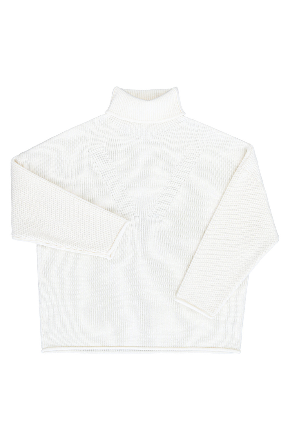 Knitted jumper with a high neck. Model of a loose silhouette with a dropped shoulder line and decorative allowances.