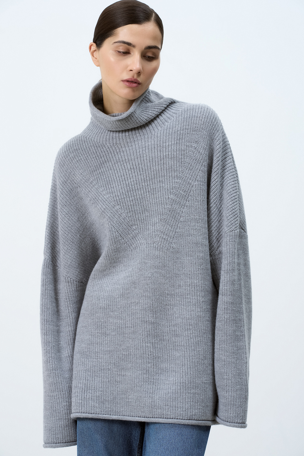 Knitted jumper with a high neck. Model of a loose silhouette with a dropped shoulder line and decorative allowances.
