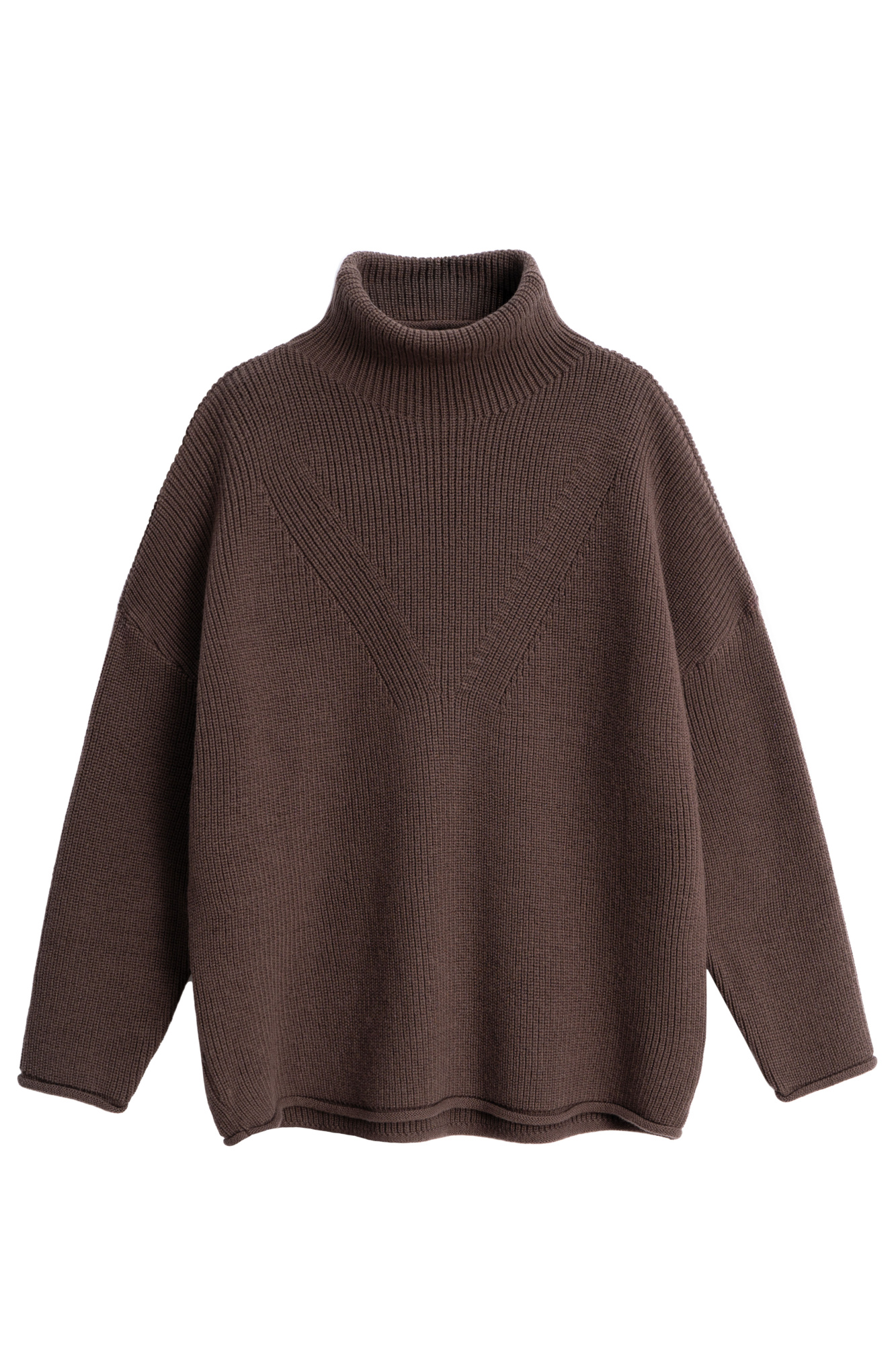 Knitted jumper with a high neck. Model of a loose silhouette with a dropped shoulder line and decorative allowances.
