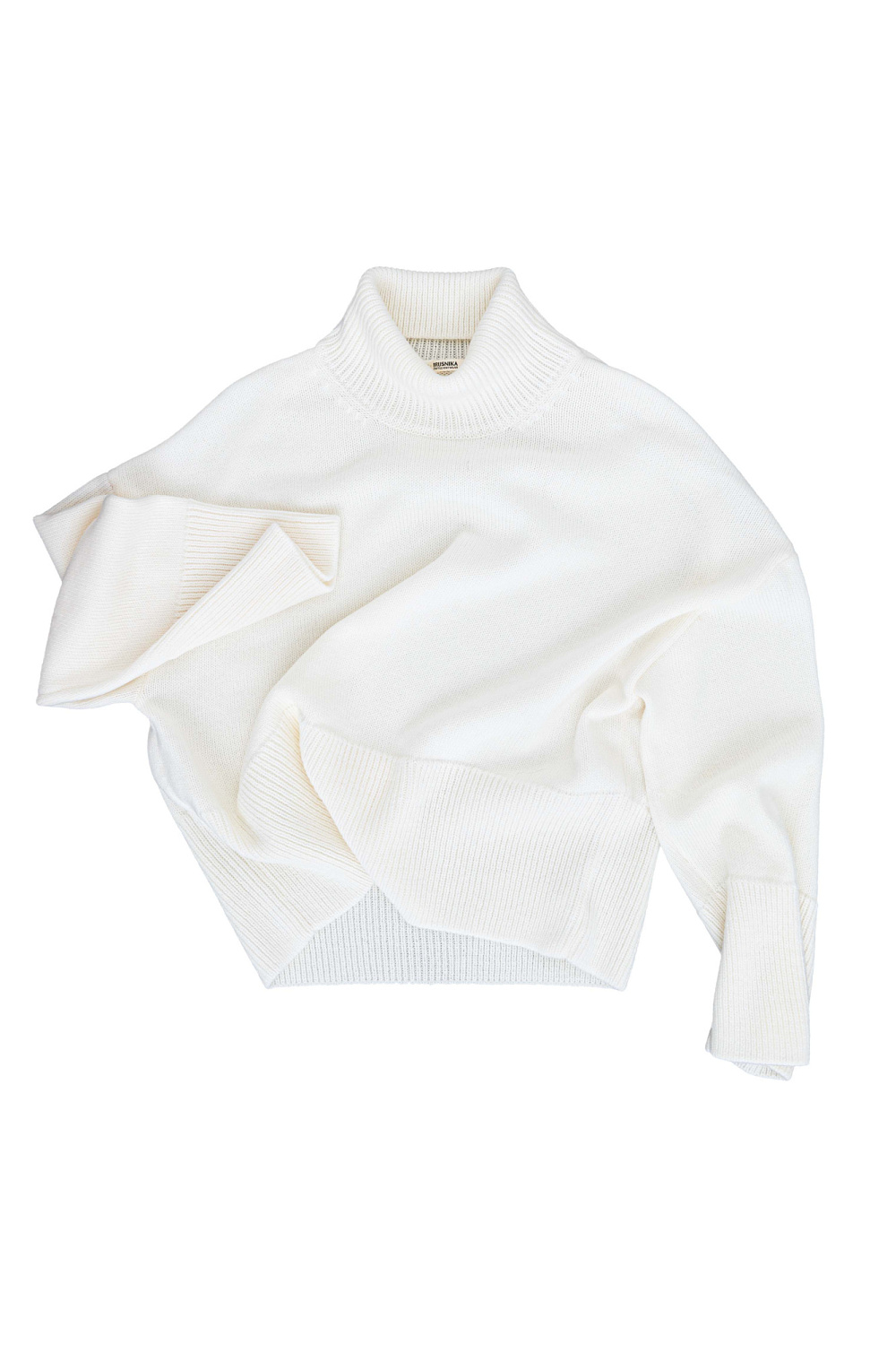 Knitted jumper with a high neck. Loose silhouette model with dropped shoulder line. The edges of the product are ribbed.