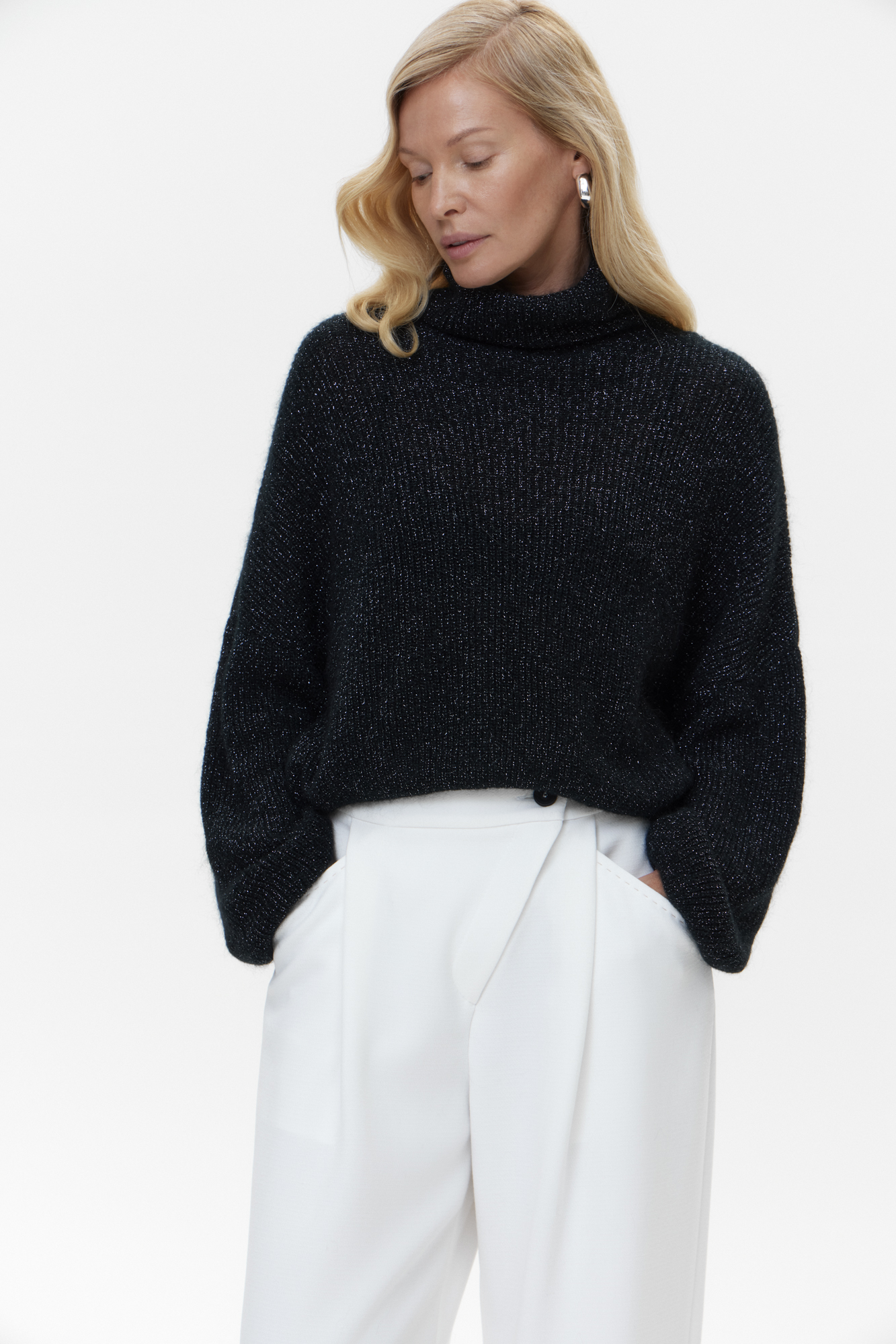 Knitted jumper with lurex. A shortened model with a loose silhouette with dropped shoulders and a knitted collar.