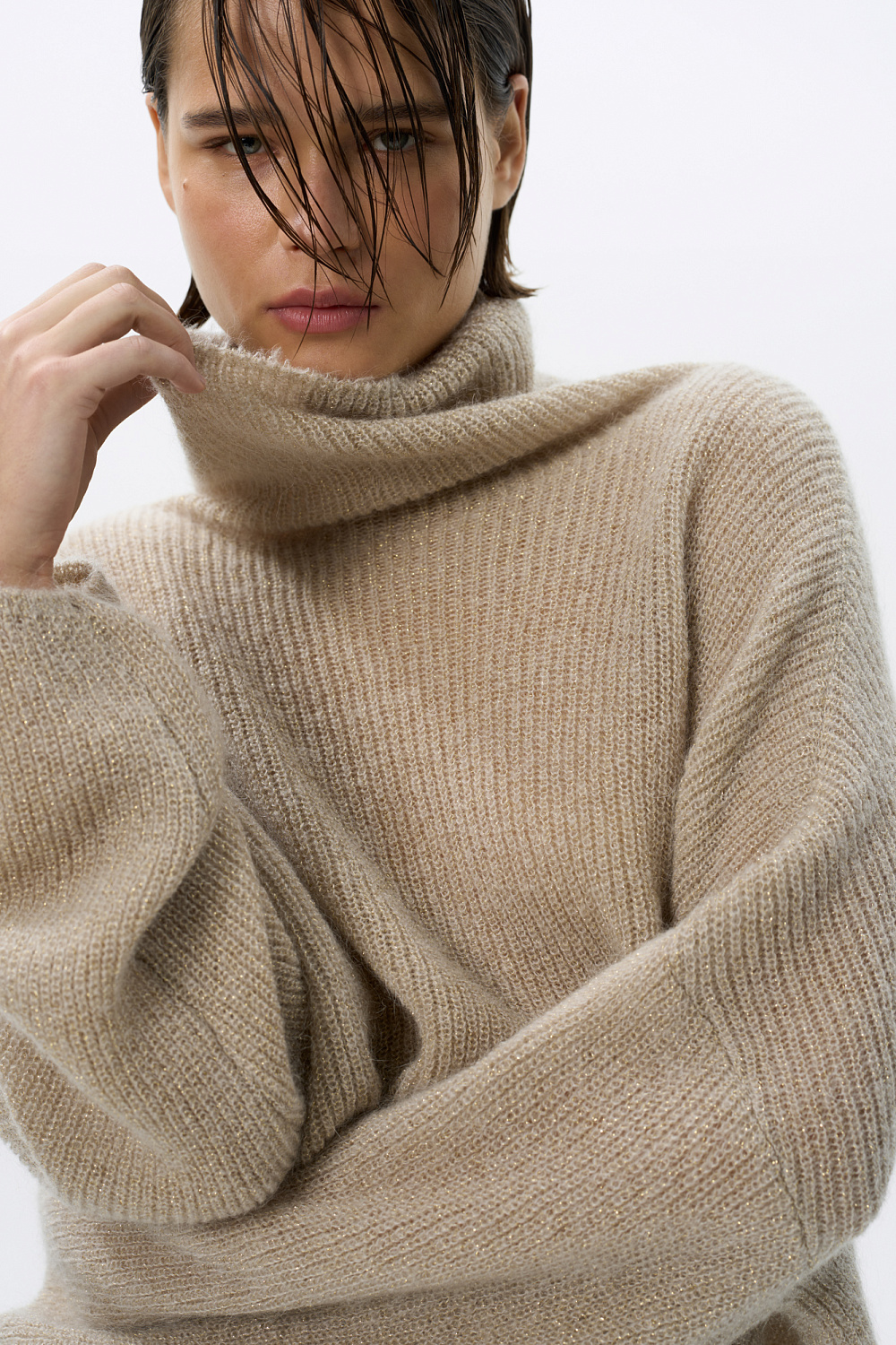 Knitted jumper with lurex. A shortened model with a loose silhouette with dropped shoulders and a knitted collar.