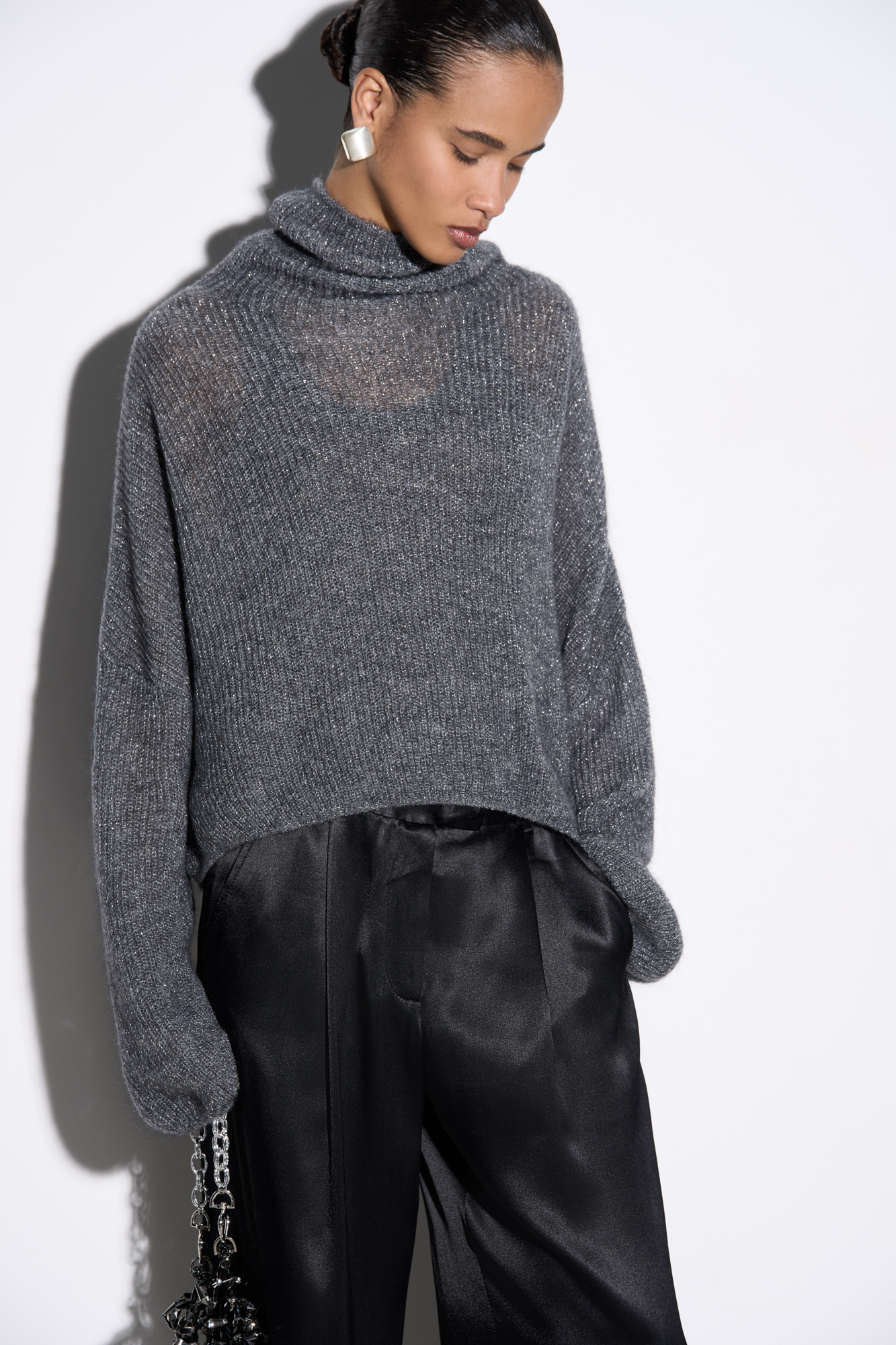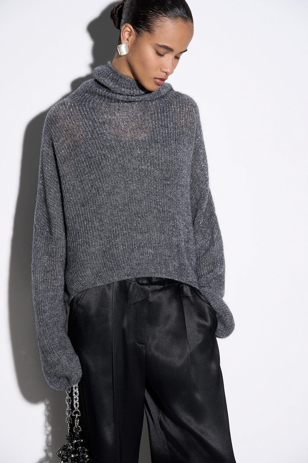 Knitted jumper with lurex. A shortened model with a loose silhouette with dropped shoulders and a knitted collar.