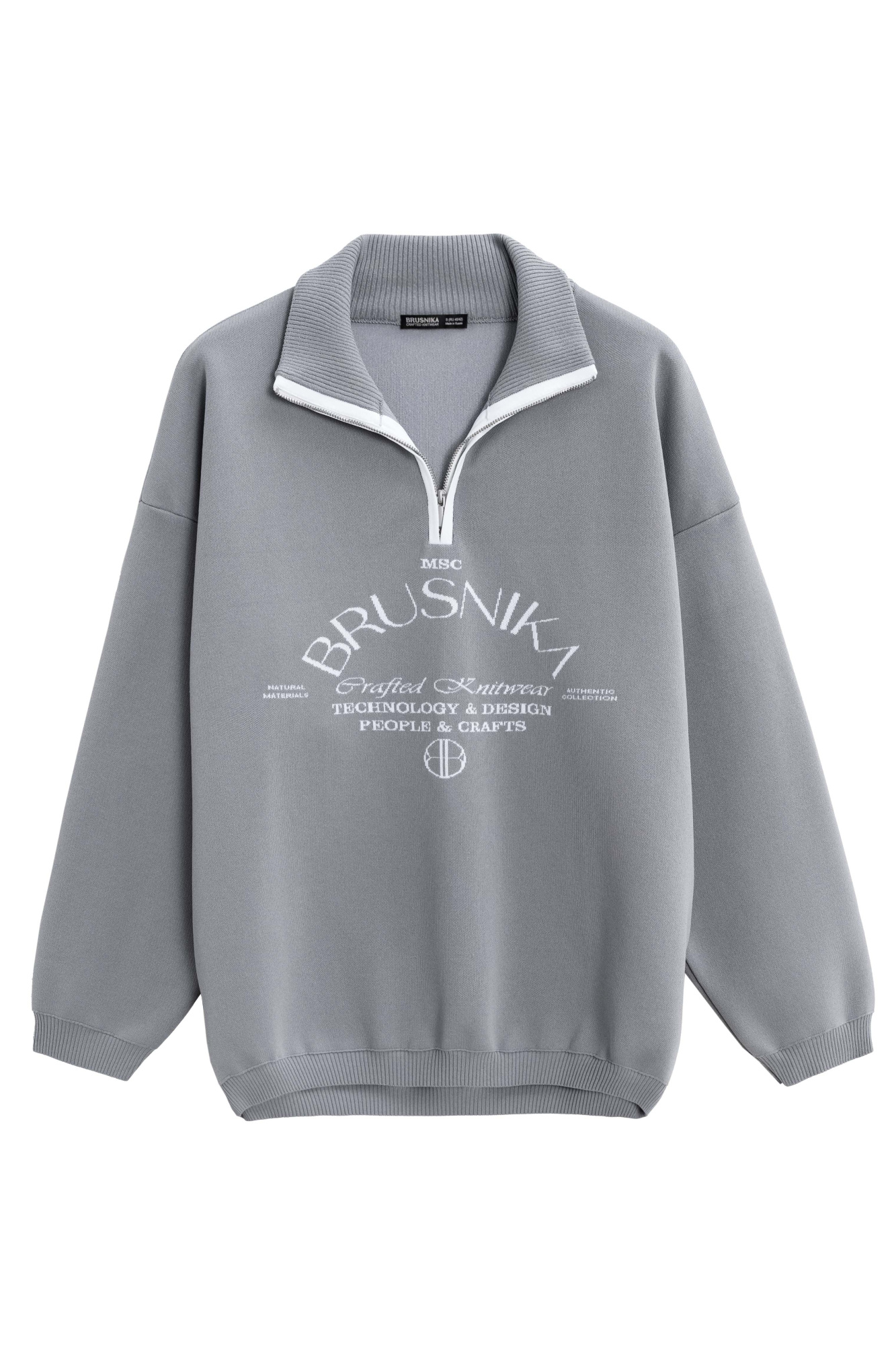Printed viscose jumper. The model has a loose silhouette with dropped shoulders and a stand-up collar fastened with a zipper. The cuffs and hem of the product are ribbed.