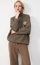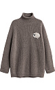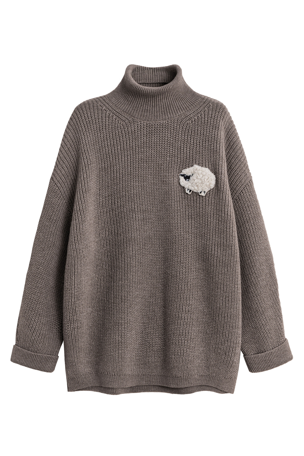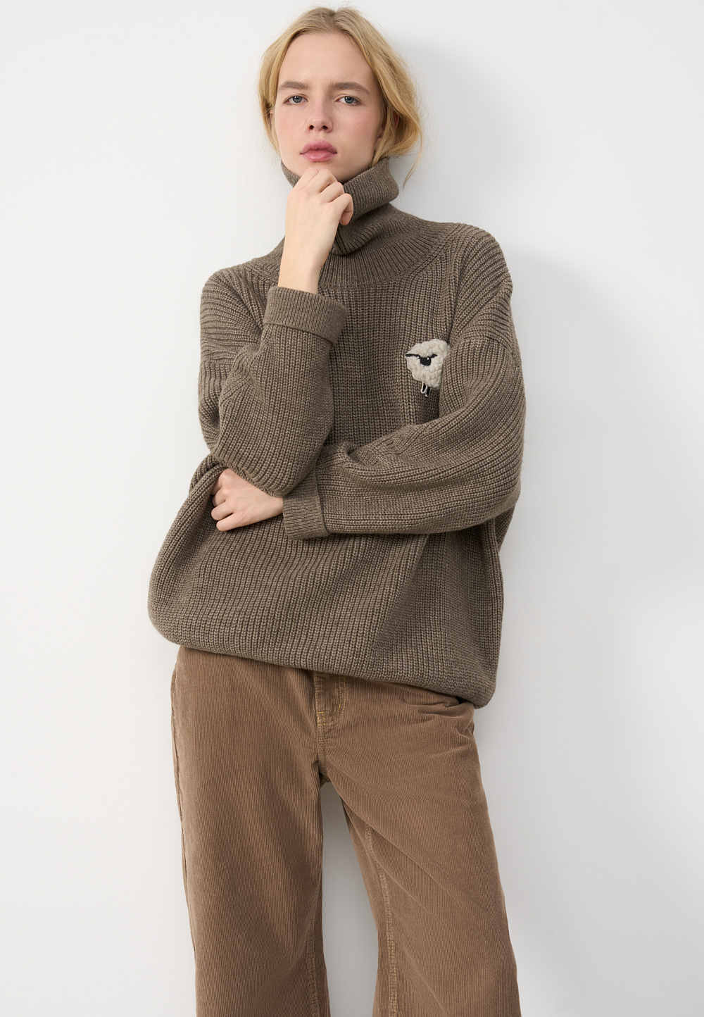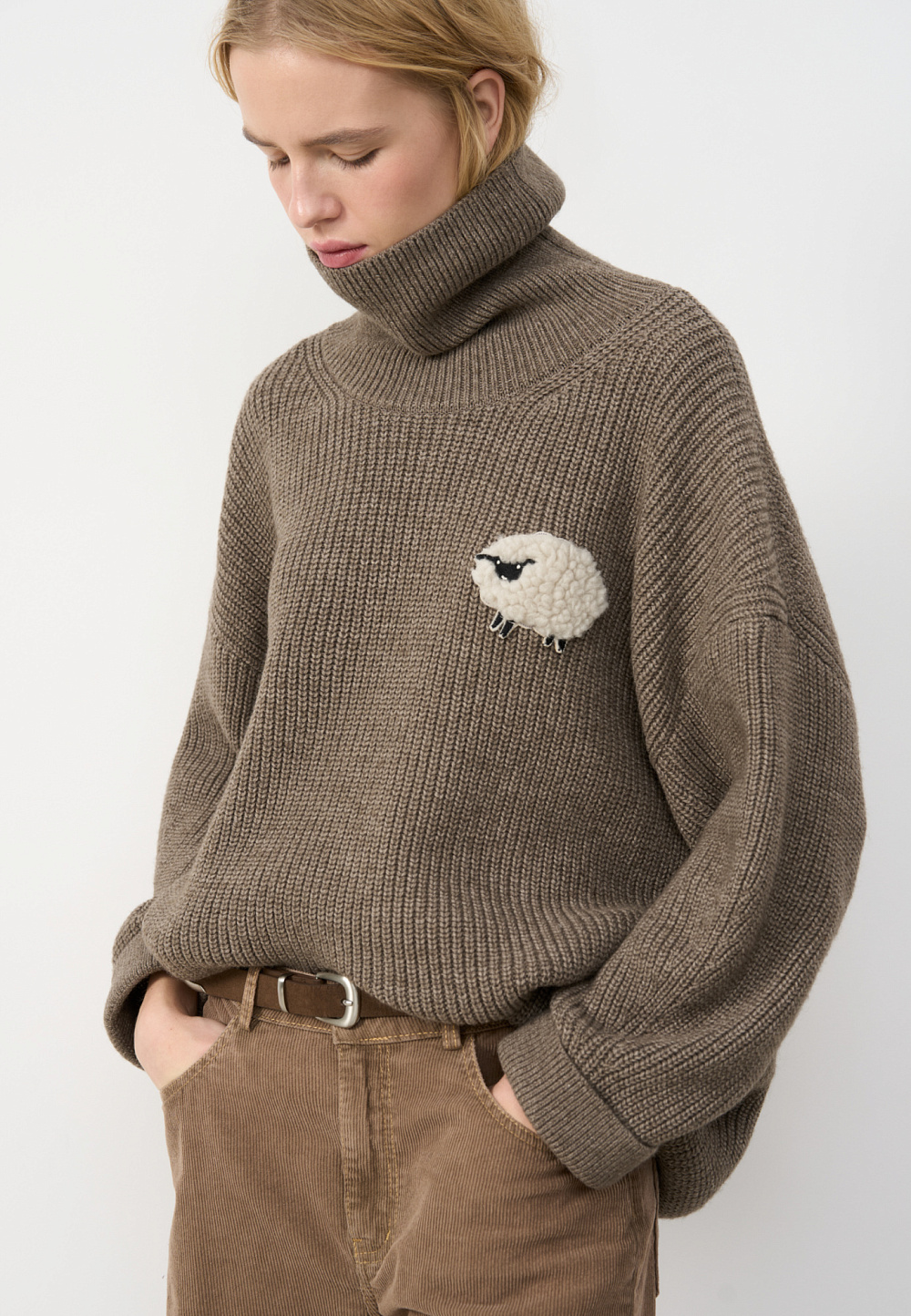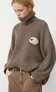 Alpaca wool knitted jumper. The model has a loose silhouette, with a high knitted neck, dropped shoulders and long sleeves with cuffs. The product is decorated with a three-dimensional element in the shape of a lamb.