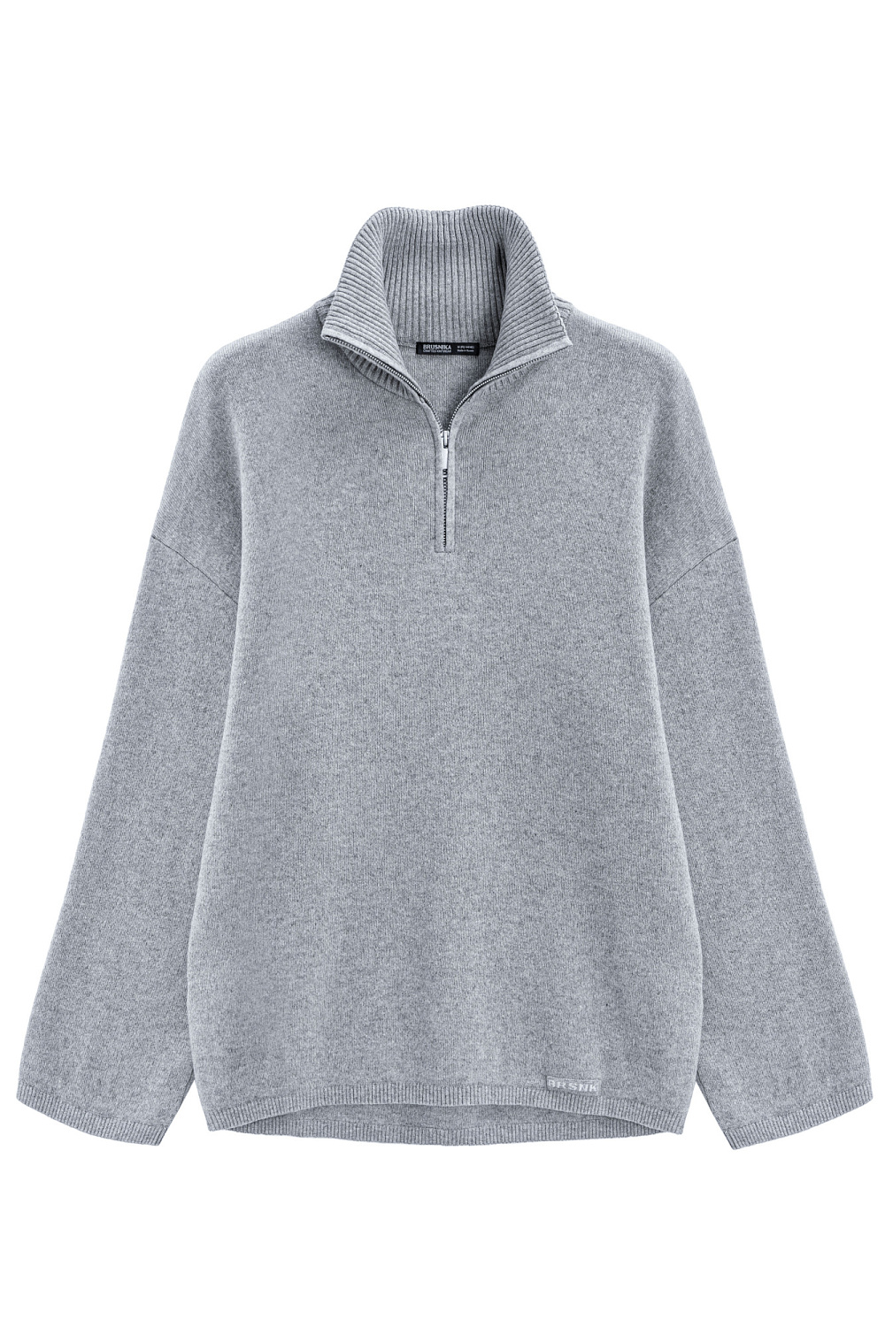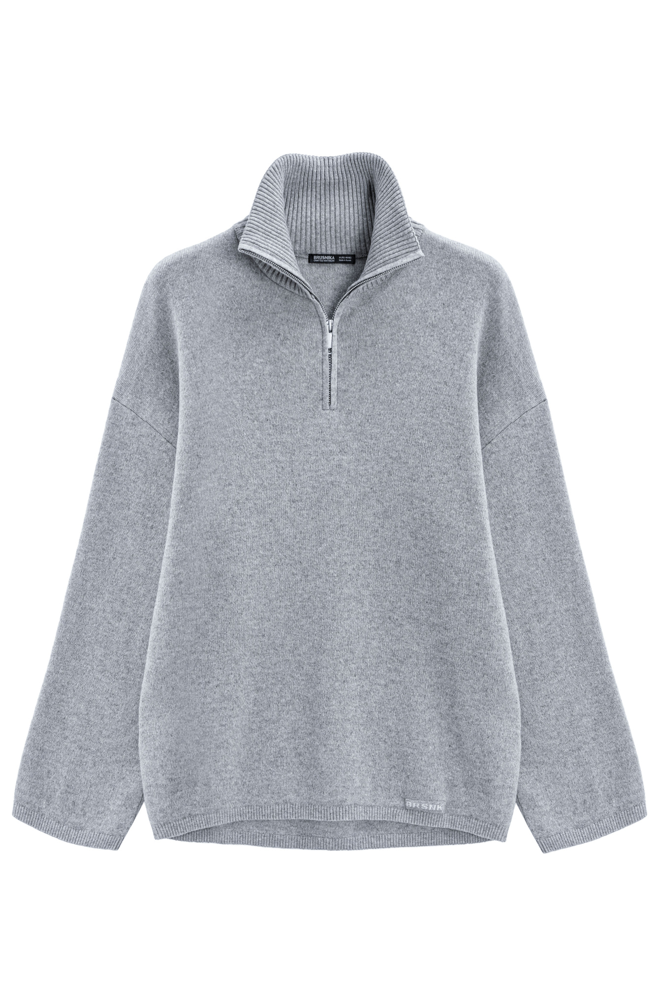 Knitted jumper made of cashmere and wool. The model has a loose fit, with a high collar with a zipper and dropped shoulders. The collar and edges of the product are ribbed.