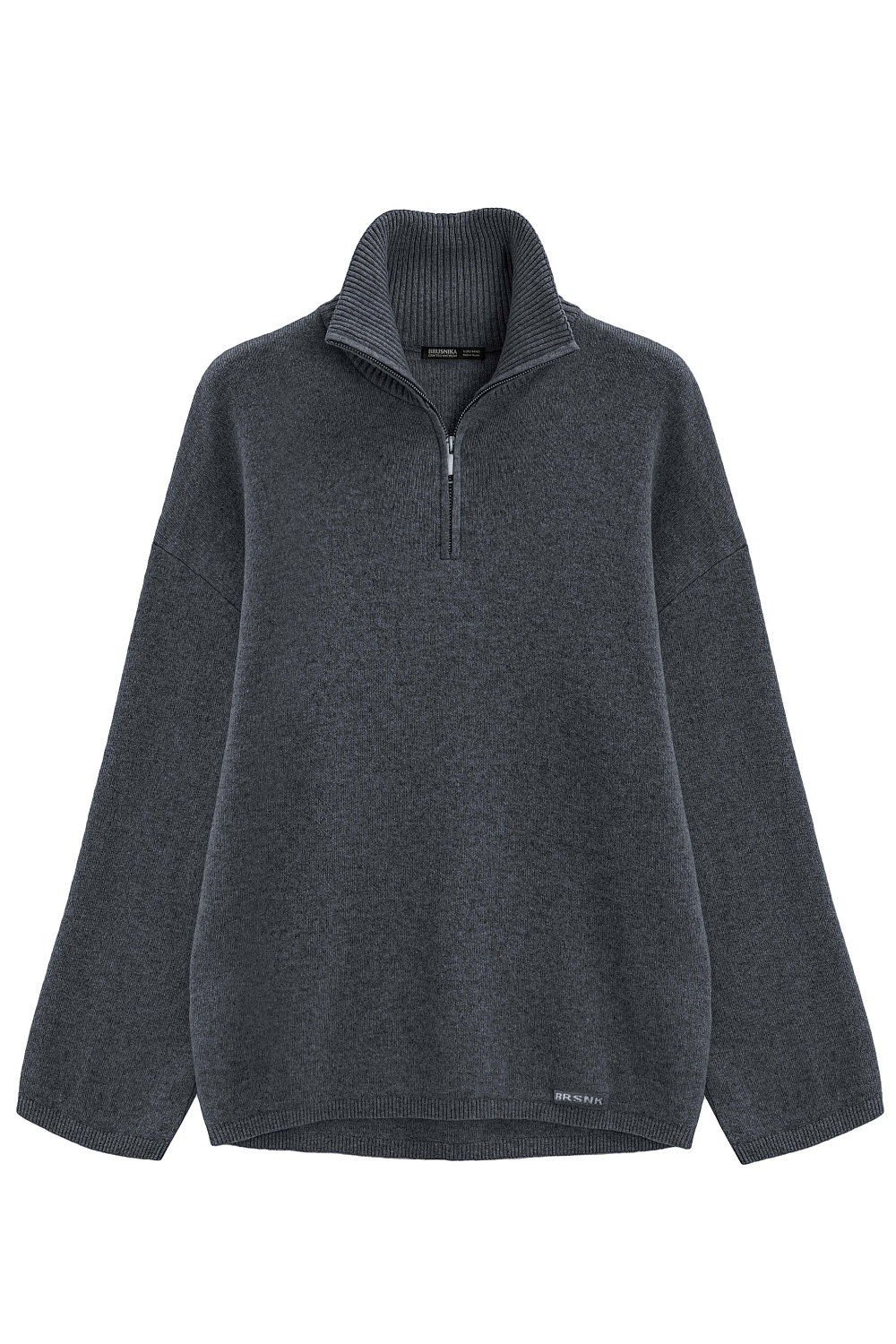 Knitted jumper made of cashmere and wool. The model has a loose fit, with a high collar with a zipper and dropped shoulders. The collar and edges of the product are ribbed.