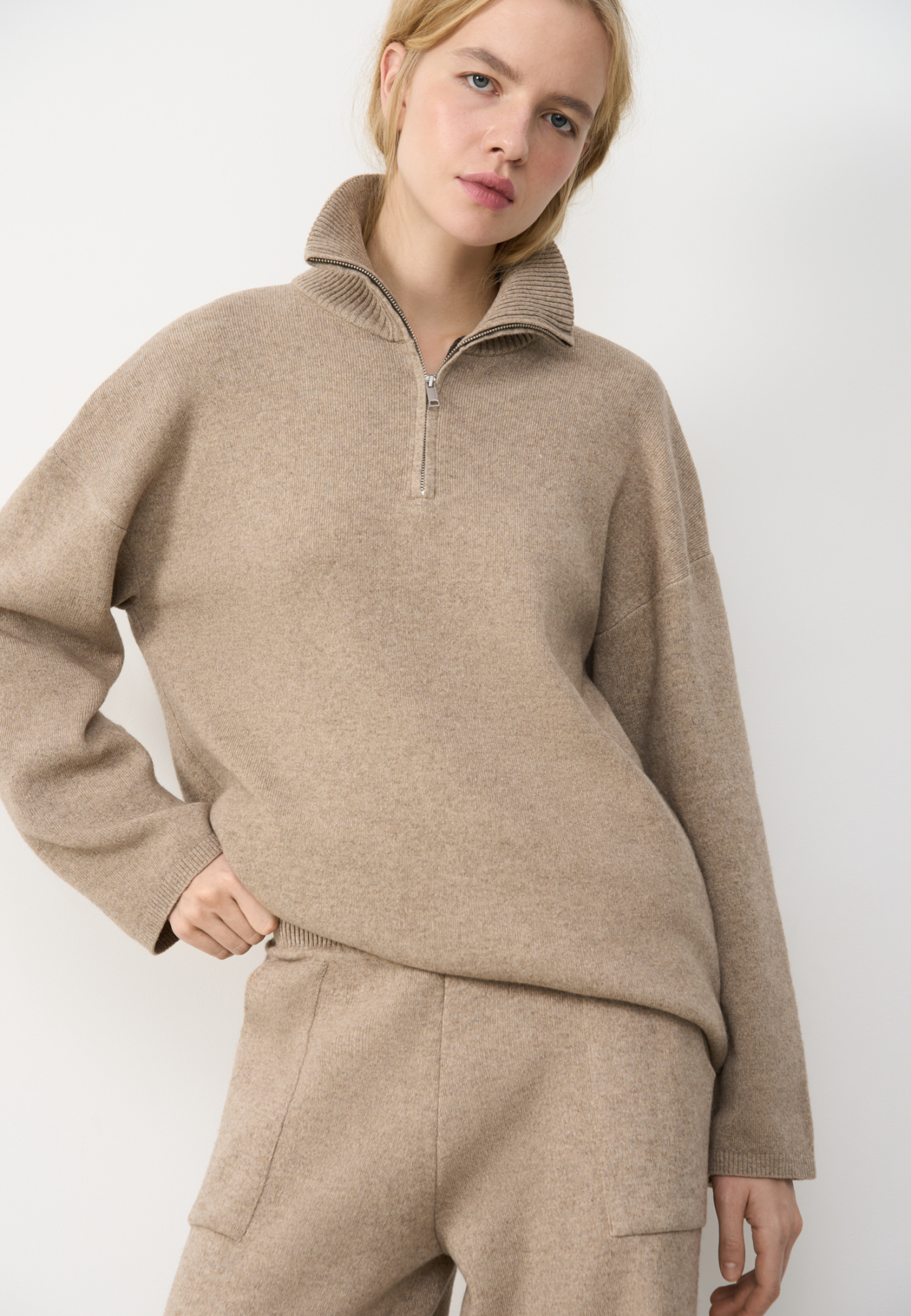 Knitted jumper made of cashmere and wool. The model has a loose fit, with a high collar with a zipper and dropped shoulders. The collar and edges of the product are ribbed.