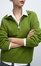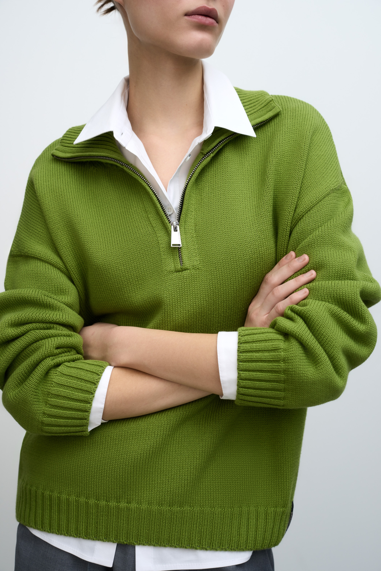 100% cotton jumper with stand-up collar. Zip closure at the top in front, ribbed edges and cuffs.