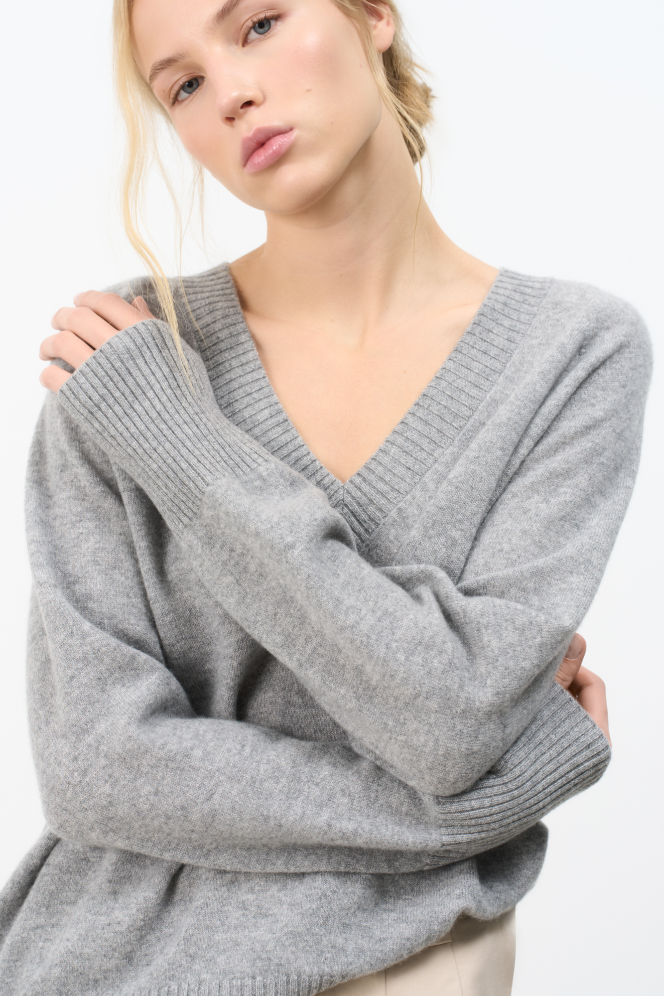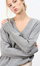 V-neck jumper made of 100% cashmere. Loose silhouette model with dropped shoulder line. The edges of the product are ribbed.