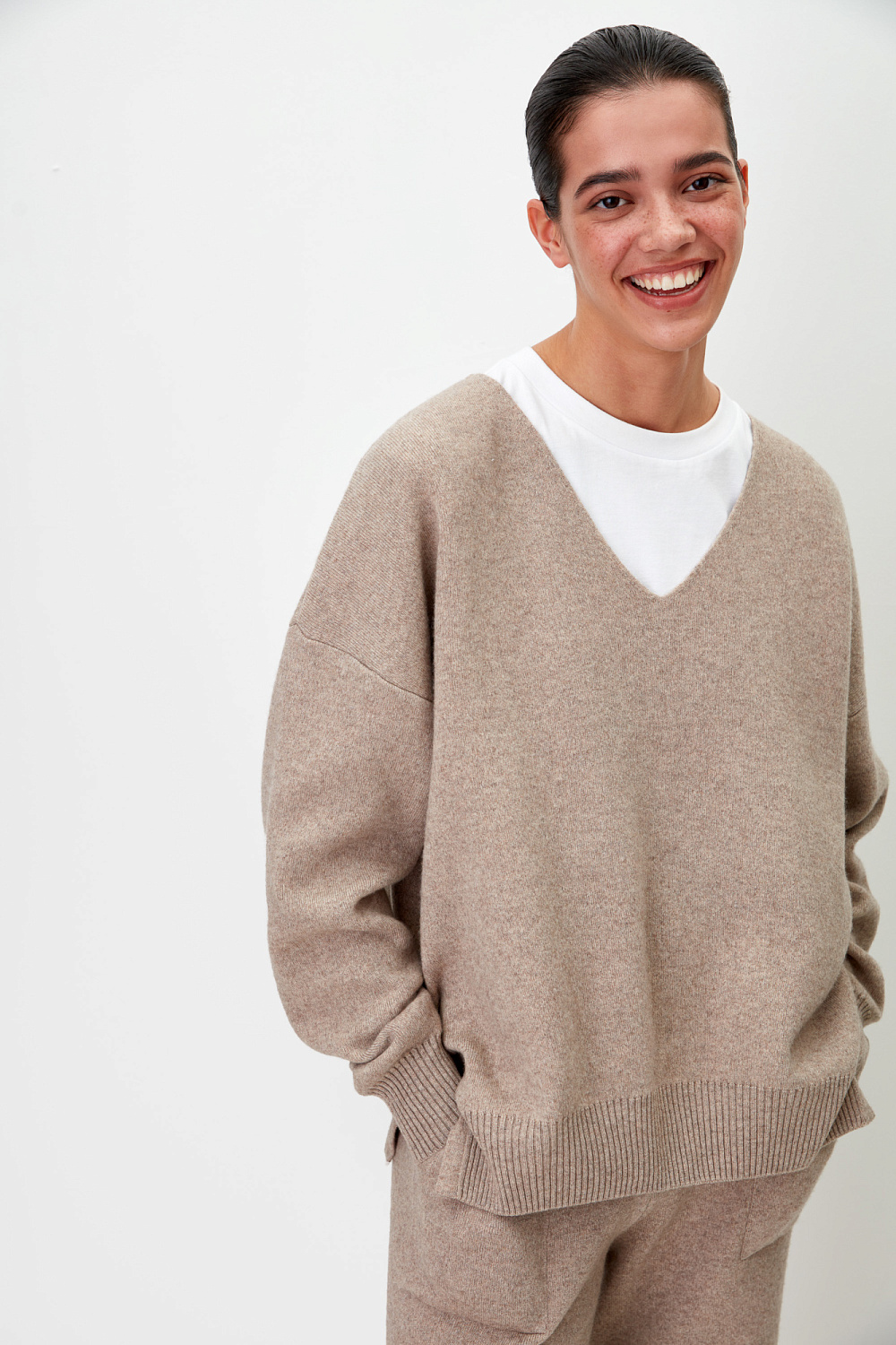 Cashmere jumper with V-neck and dropped shoulders.