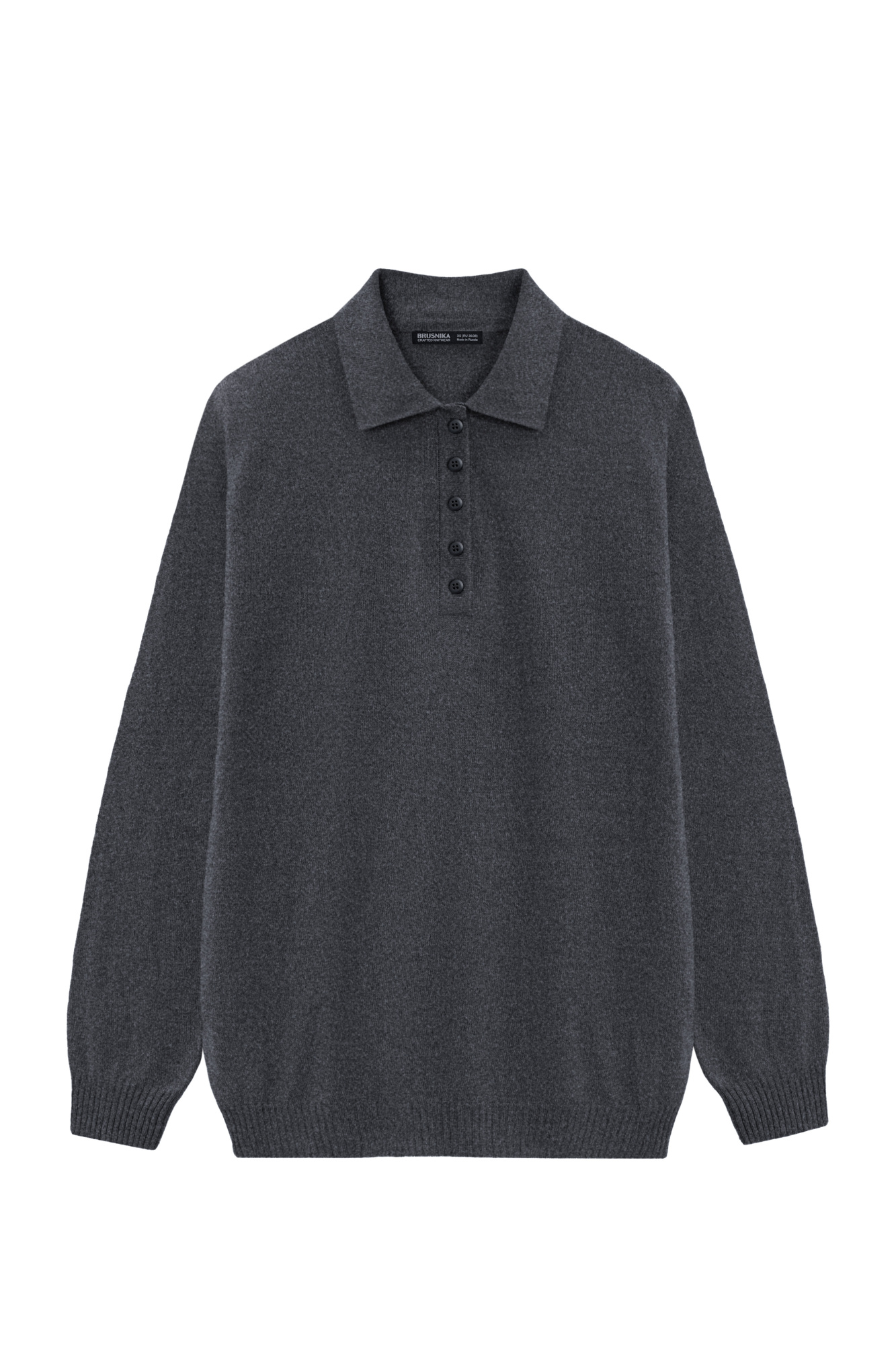 Knitted jumper made of cashmere and wool. Straight silhouette with dropped shoulders and a polo collar with buttons. The sleeve cuffs and hem are ribbed.