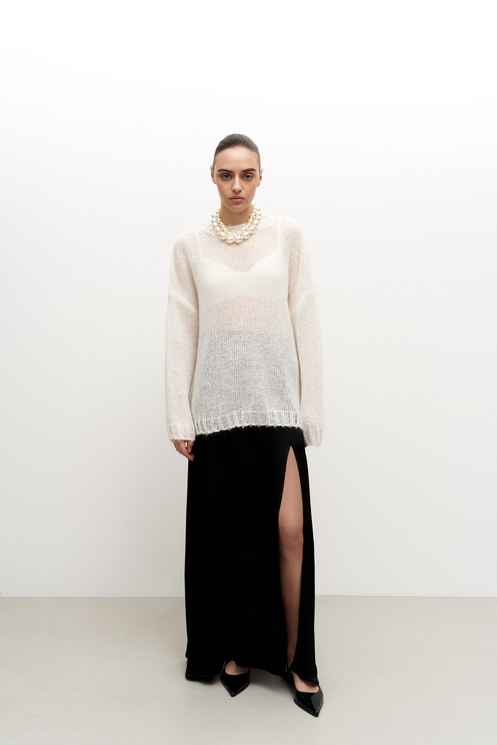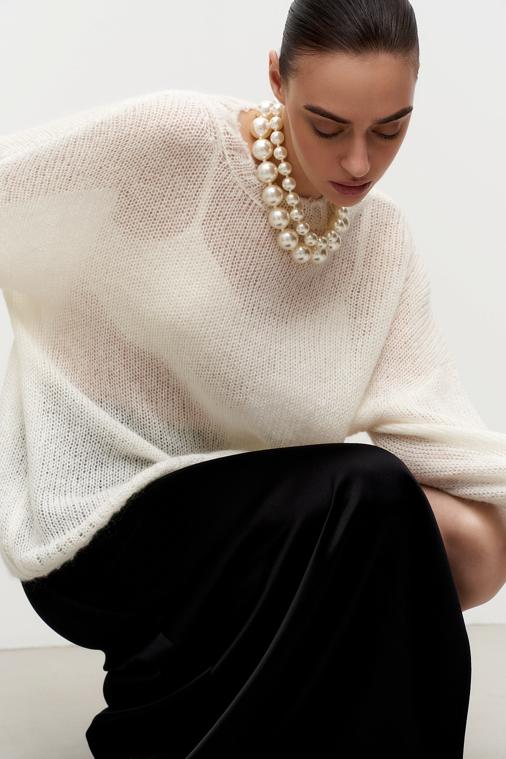 Semi-sheer openwork jumper with dropped shoulders. Lightweight jumper made from soft yarn. Wide ribbed cuffs and hem.