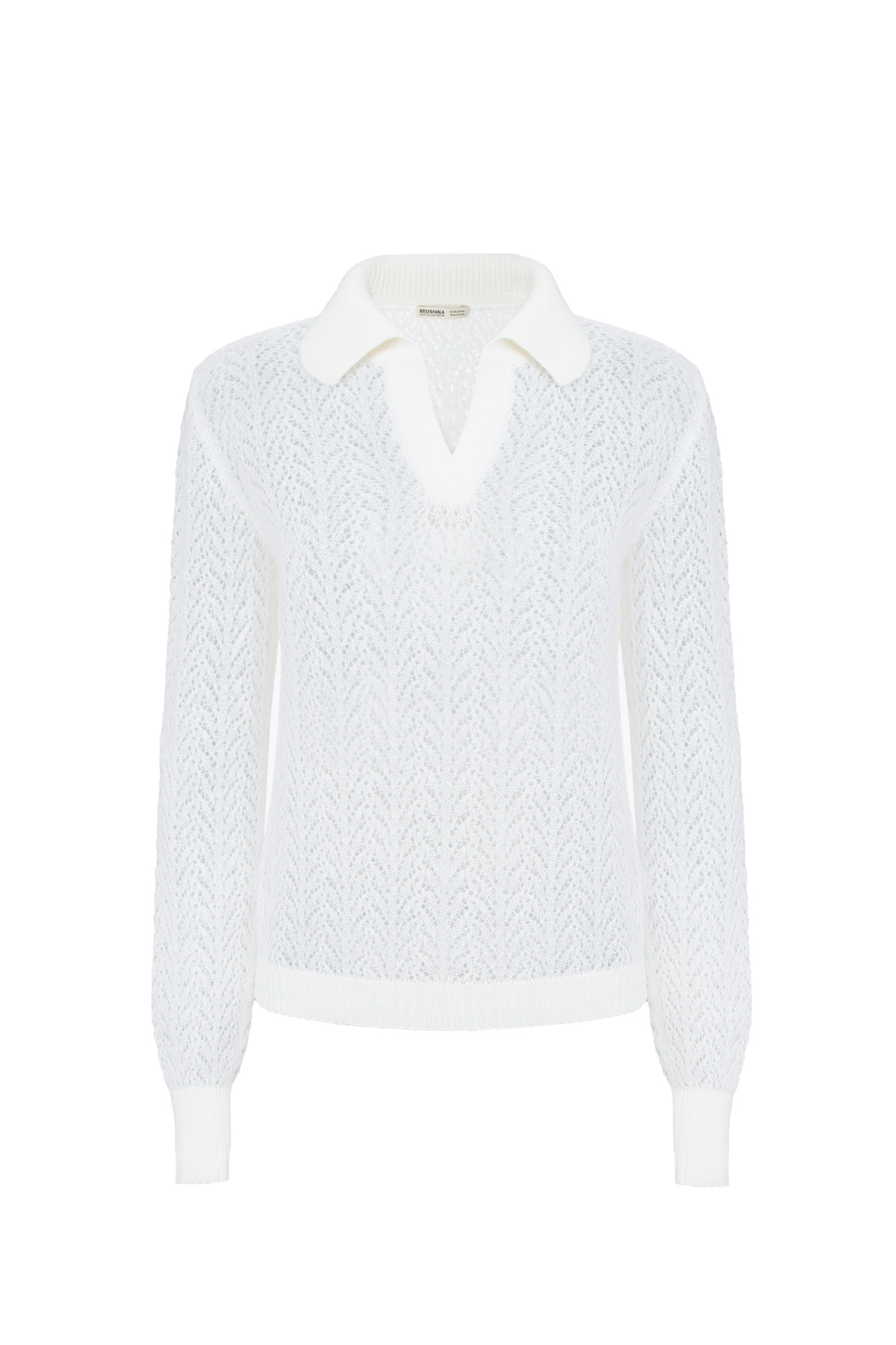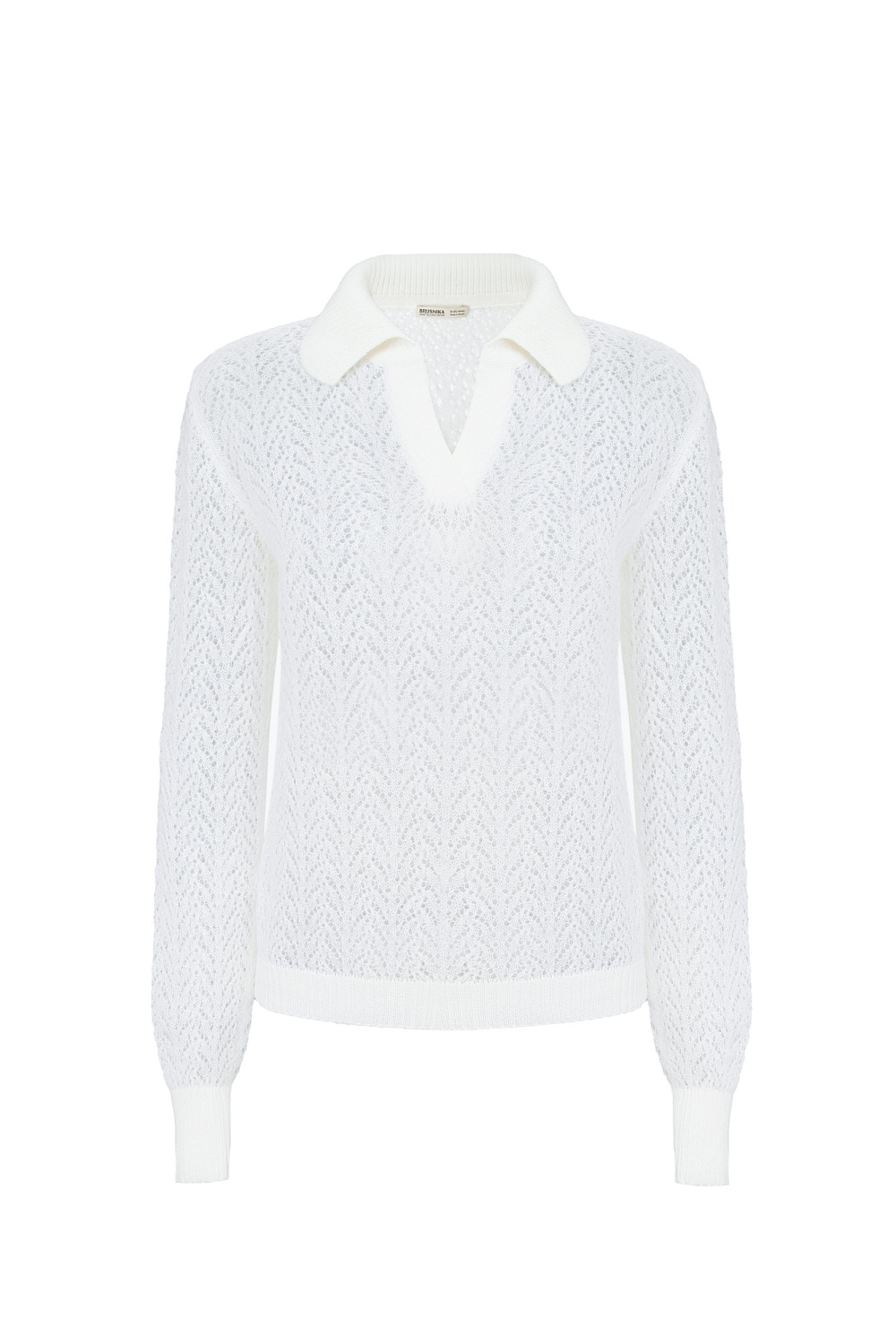 Openwork wool-mohair blend jumper with polo collar. The jumper is semi-sheer, we recommend wearing a top underneath. You can complete the look with a faux leather skirt.
