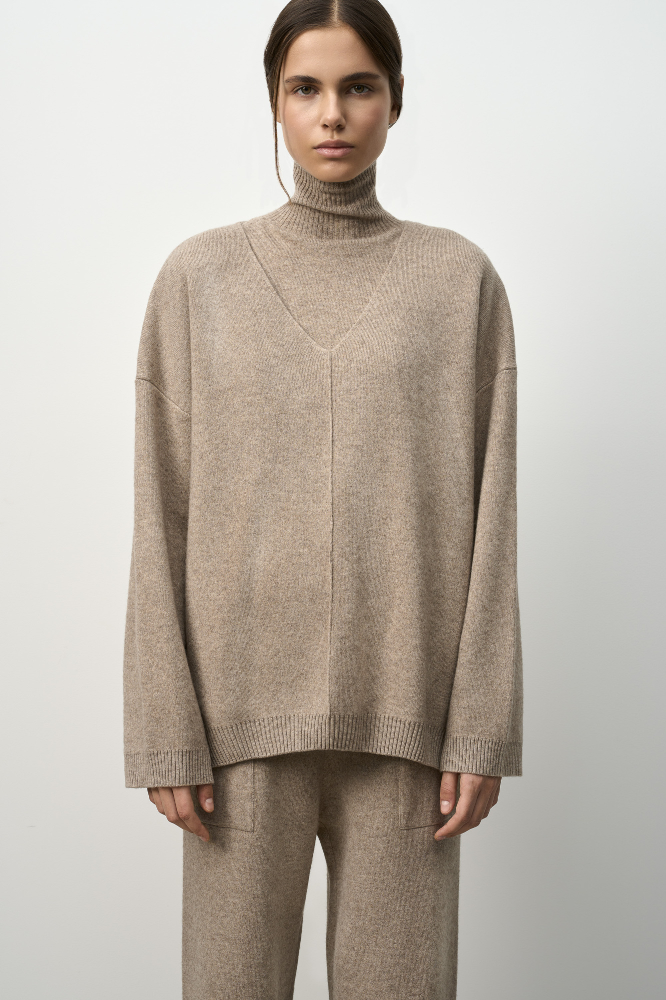 Cashmere and wool knit jumper with V-neckline, dropped shoulders and piping-detail in the middle.