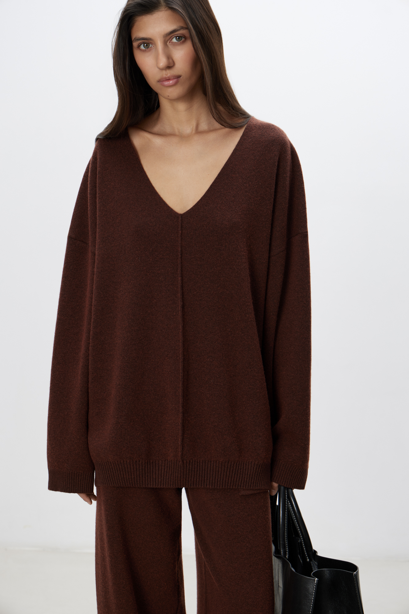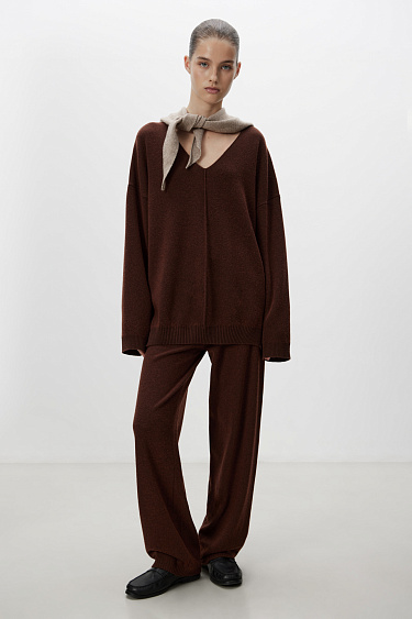 Cashmere and wool knit jumper with V-neckline, dropped shoulders and piping-detail in the middle.