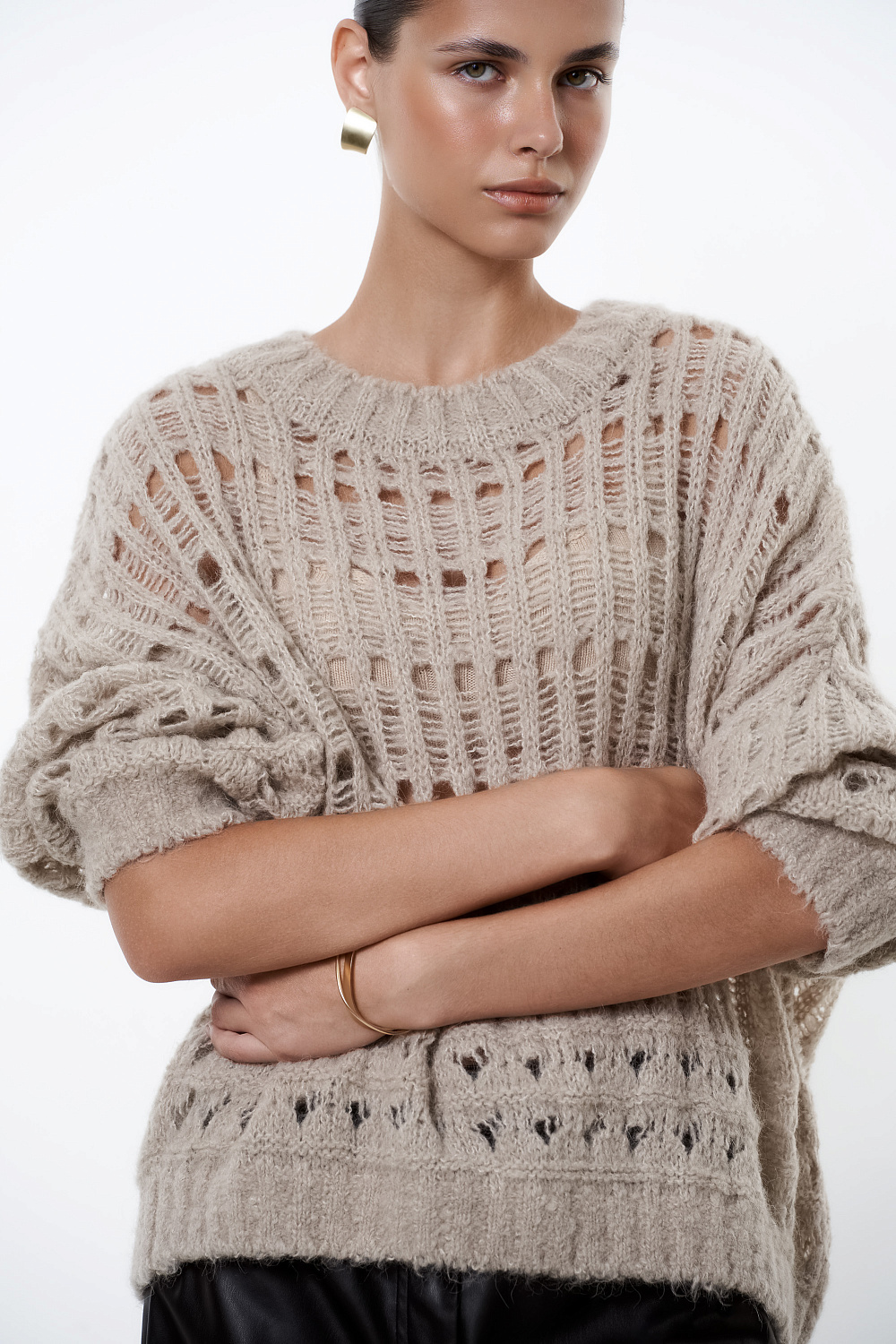 Alpaca wool knit jumper with dropped shoulders and round neckline. Loose silhouette, ribbed hem and cuffs.