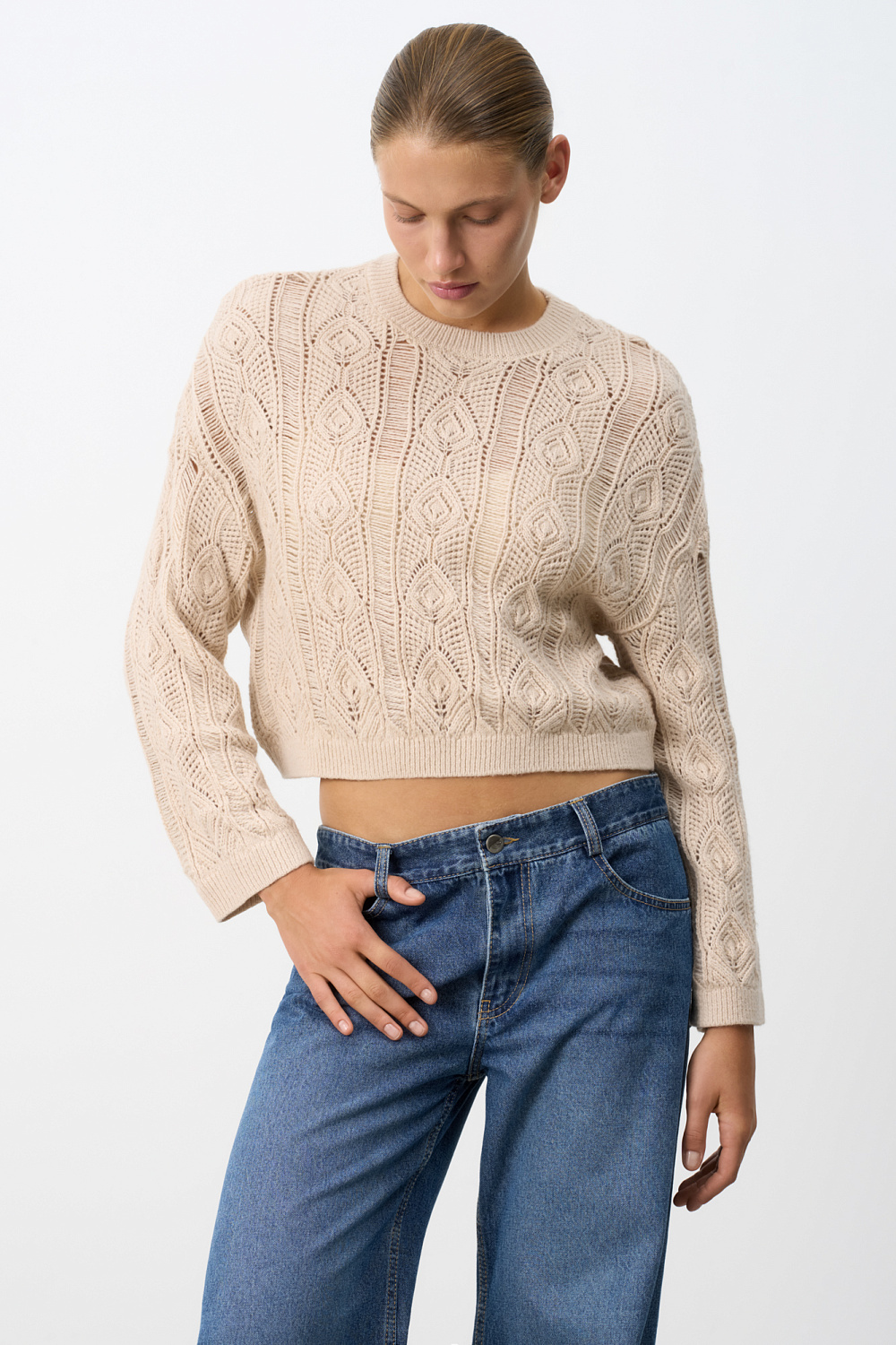 Openwork alpaca wool jumper with a round neckline. Loose silhouette with dropped shoulder line. Ribbed cuffs and hem.
