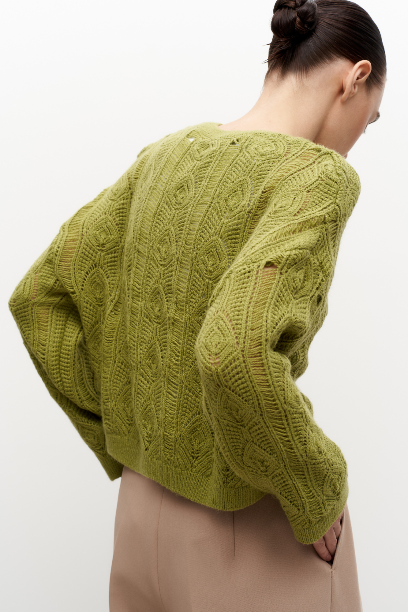 Openwork alpaca wool jumper with a round neckline. Loose silhouette with dropped shoulder line. Ribbed cuffs and hem.