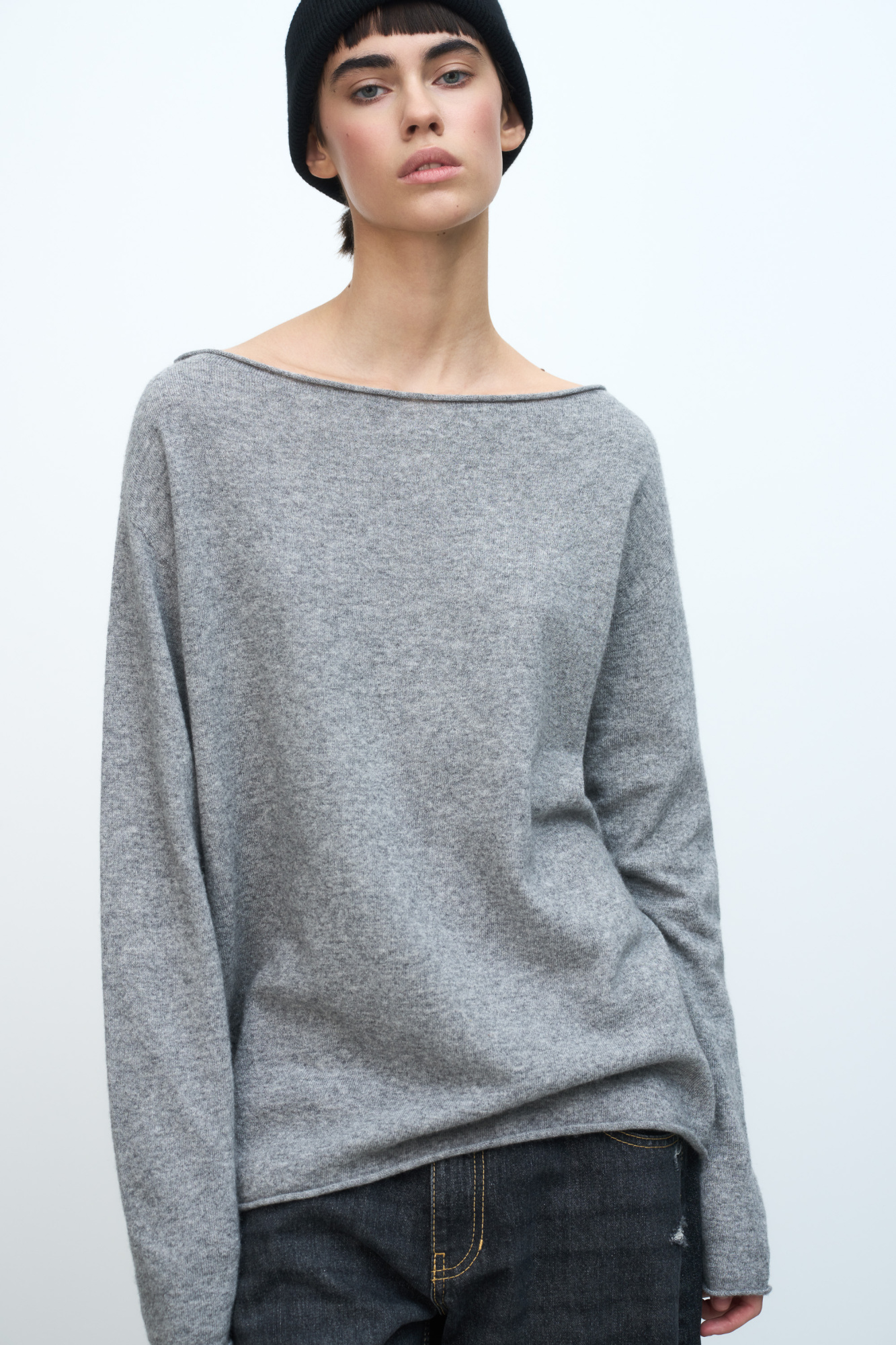 Wool and cashmere knit jumper with rolled edges and dropped shoulders.