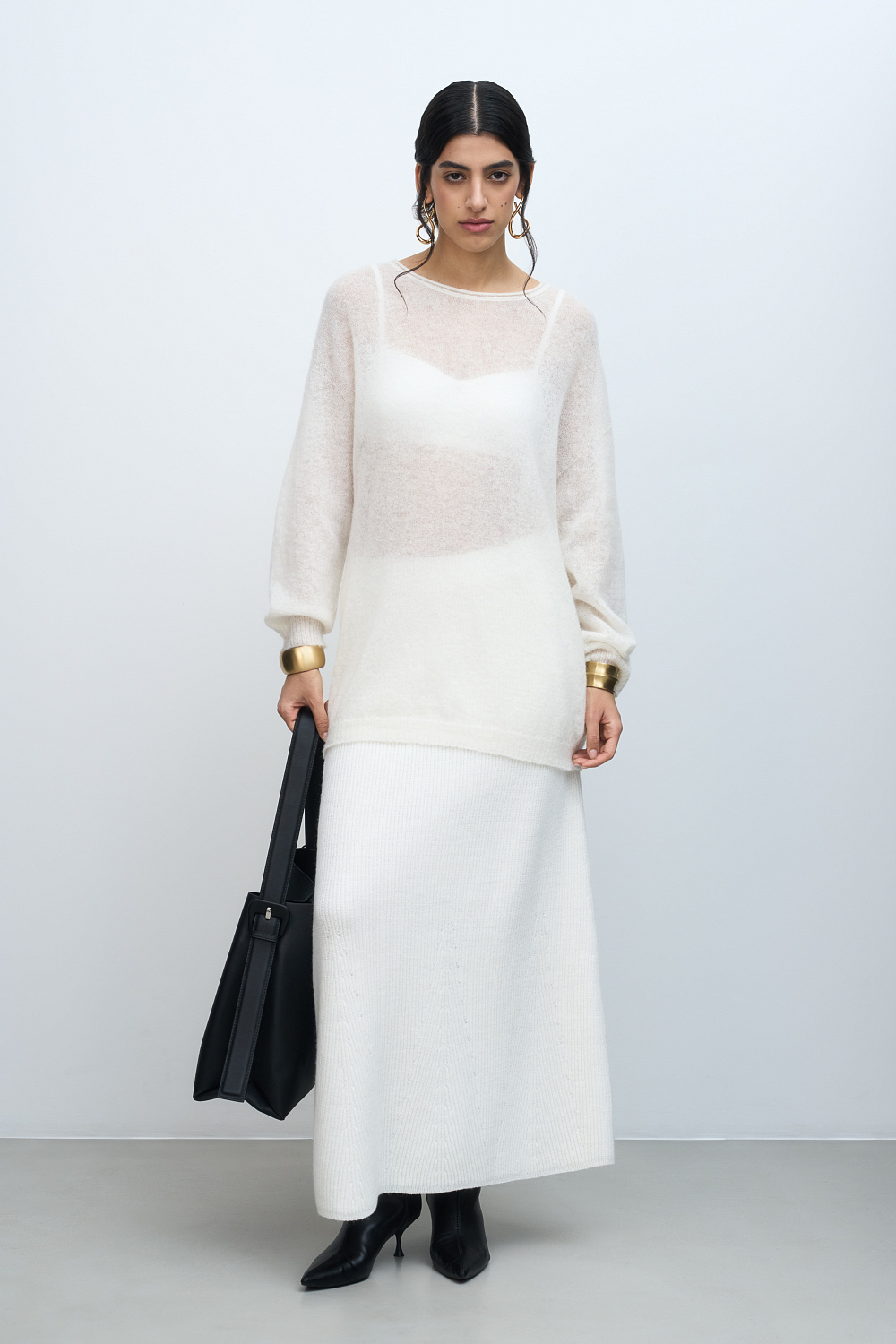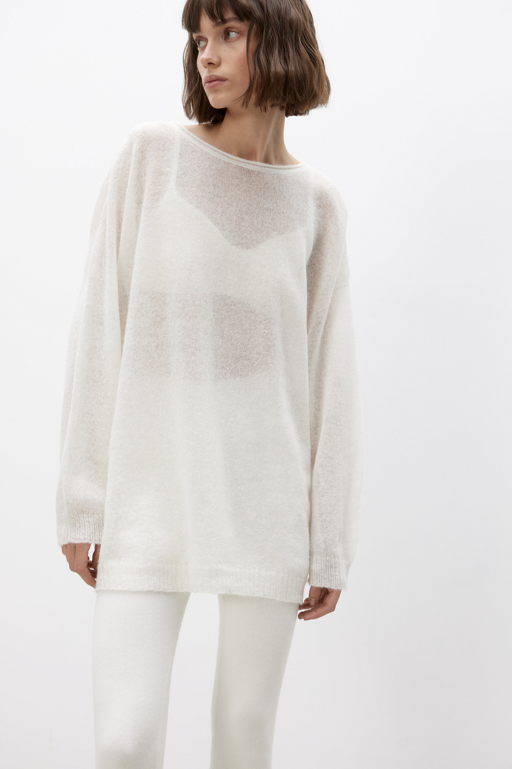Semi-seer knit jumper made of extrafine merino and alpaca wool blend. Loose silhouette and dropped shoulder. Pair with a sequin maxi skirt for a festive look or with jeans for a casual look.