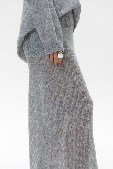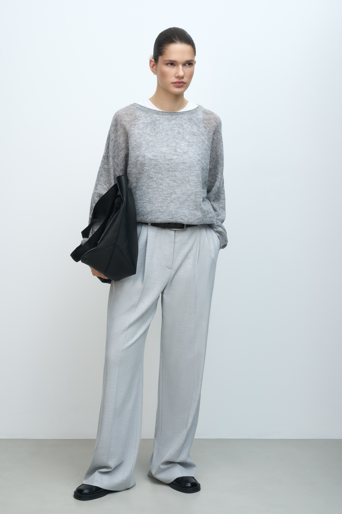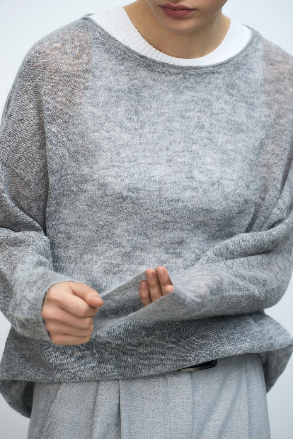 Semi-seer knit jumper made of extrafine merino and alpaca wool blend. Loose silhouette and dropped shoulder. Pair with a sequin maxi skirt for a festive look or with jeans for a casual look.